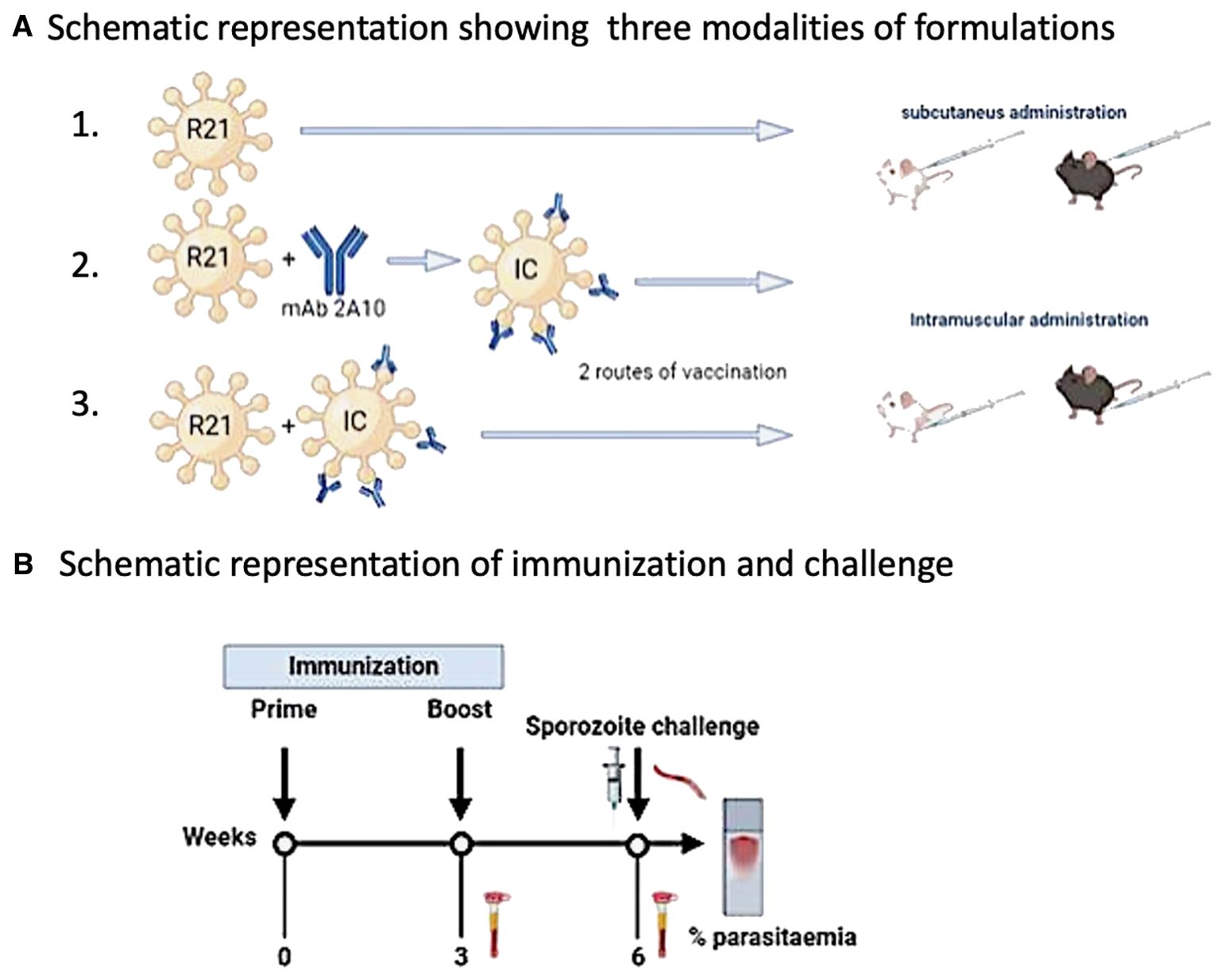 Despite its success in viral disease models, IC-based vaccination has not been explored for parasitic diseases. R21/MM, recently licensed malaria vaccine, has been shown to induce sterile protection in preclinical models with three intramuscular (IM) immunizations (17, 18). This short -term study aims to evaluate the immunogenicity and protective efficacy of R21/MM administered via the subcutaneous (SC) route, using only two doses, and to assess whether these responses are enhanced when delivered as an IC or co-administered with R21 + IC/MM via both IM and SC routes.
