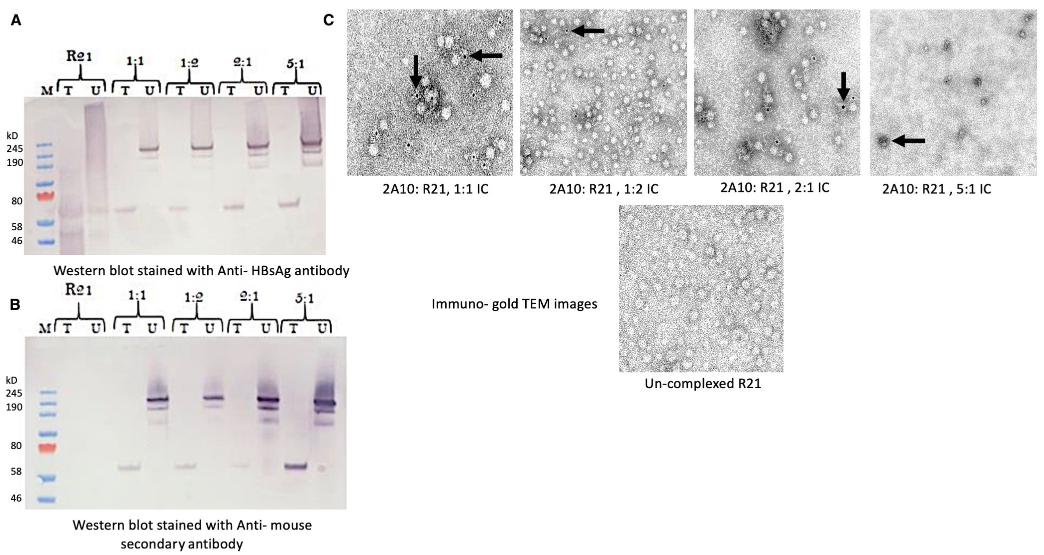 Figure 2. Confirmation of R21: mAb 2A10 immune complex (IC) formation: Four different ratios of anti- NANP mAb 2A10:R21 (1:1, 1:2, 2:1 and 5:1) incubated as described earlier to form an antibody: VLP immune complex. For western blot, the IC were treated (T) and un-treated (U) under reducing conditions and the blot was stained with (A) anti-HBsAg antibody to stain the HBsAg component of the R21 VLP and (B) with anti-mouse secondary antibody to stain the anti- NANP mAb 2A10 complexed to R21 forming an IC of high molecular weight (~200kD), seen in both blots (A–C). (C) Immuno- gold TEM of 2A10: R21 complexed in different ratios and un-complexed R21 as a control. Arrows indicate staining of mAb 2A10 complexed with R21 VLP. Scale 100-200nm.