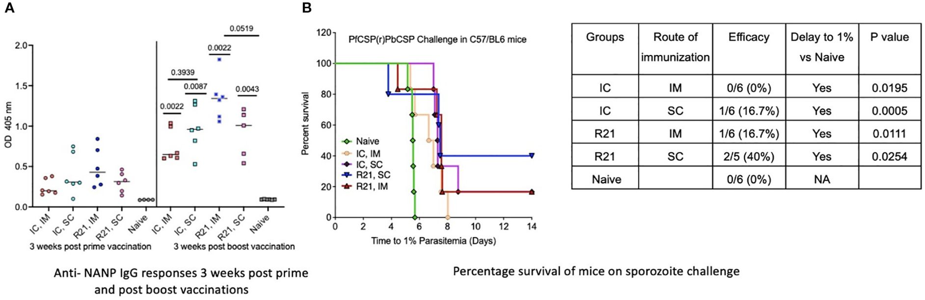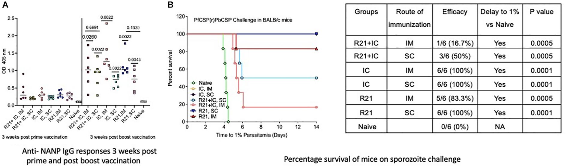 Results: R21/MM administered via the SC route is immunogenic and more efficacious (100% in BALB/c mice) than the IM route. R21:2A10 IC/MM is immunogenic and induces sterile protection in BALB/c mice. Co-administration of R21/MM with R21:2A10 IC is immunogenic but less protective than IC/MM alone in BALB/c mice.