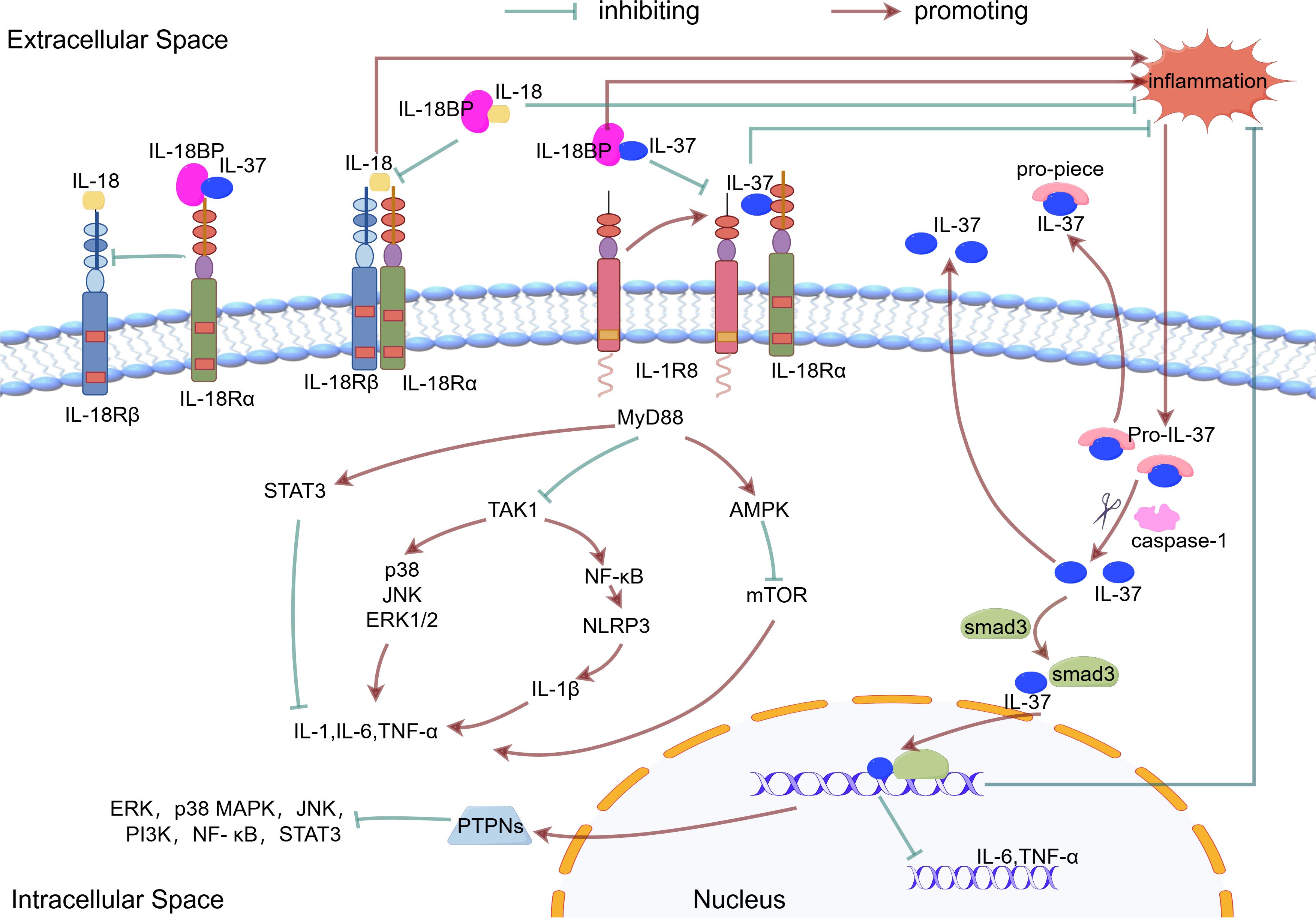 Figure 1. The mechanism of action of IL-37. Inflammatory stimuli increase the production of the precursor form of IL-37. This precursor is processed into mature IL-37 by caspase1. The mature IL-37 interacts with phosphorylated activated Smad3 in the cytoplasm, which contributes to nuclear translocation and gene transcription regulation. Both the precursor and mature forms of IL-37 are released from cells via non-classical secretion pathways. IL-37 binds to IL18Ra or IL18BP, which enhances the inhibition of IL18 and reduces the inflammatory response. IL-37 binds to IL-18Rα and recruits IL-1R8. This complex mediates the extracellular function of IL-37.