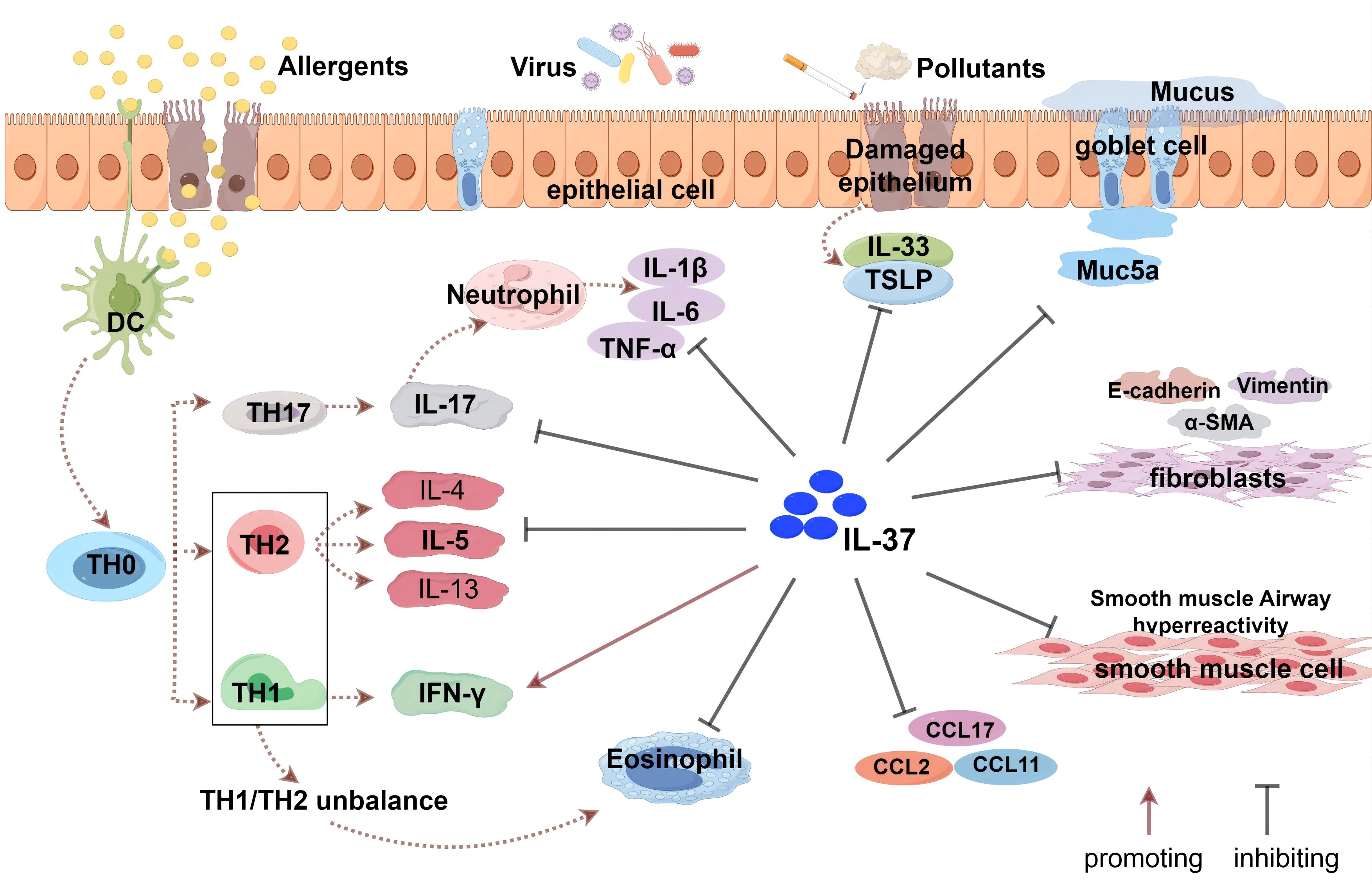 Figure 2. The role of IL-37 in asthma. IL-37 indirectly enhances the levels of IFN-γ by regulating the balance between Th1 and Th2 cells, but does not directly activate Th1 cells. It inhibits the responses of Th2 and Th17 cells and suppresses the production of related cytokines (such as IL-4, IL-5, IL-17, etc.) and eosinophil chemoattractant protein (CCL11). Additionally, IL-37 affects bronchial epithelial cells, airway smooth muscle cells, and fibroblasts, modulating the secretion of related cytokines and chemokines, including TSLP and IL-33 produced by epithelial cells. IL-37 can also inhibit the epithelial-mesenchymal transition (EMT) process, which is associated with the thickening of the airway wall and subepithelial fibrosis.