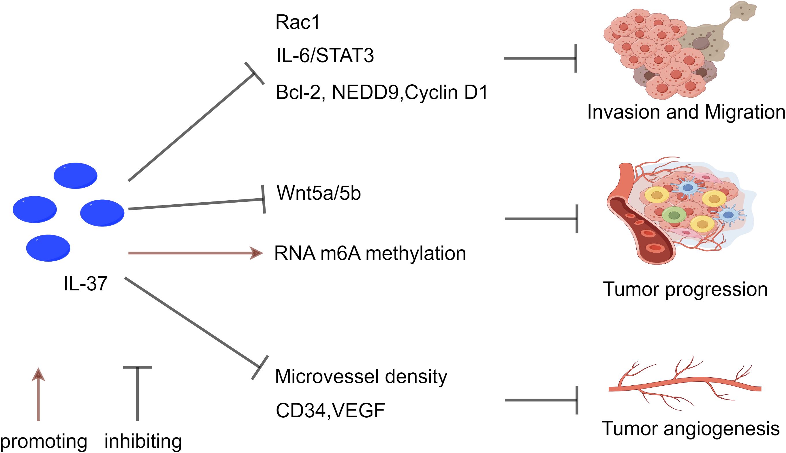 Figure 3. The inhibitory effect of IL-37 on NSCLC. IL-37 suppresses tumor metastasis and invasion through multiple pathways. It inhibits Rac1 activation and the IL-6/STAT3 pathway, reducing downstream targets Bcl-2, NEDD9, and Cyclin D1. Moreover, IL-37 influences tumor progression by modulating RNA m6A methylation in T lymphocytes, while also inhibiting the Wnt5a/5b pathway and pro-apoptotic protein expression. Additionally, IL-37 contributes to the regulation of tumor angiogenesis by decreasing levels of CD34 and VEGF, which are associated with tumor angiogenesis. The reduction in IL-37 expression correlates with high microvascular density (MVD), emphasizing its significance in tumor angiogenesis, metastasis, and progression.