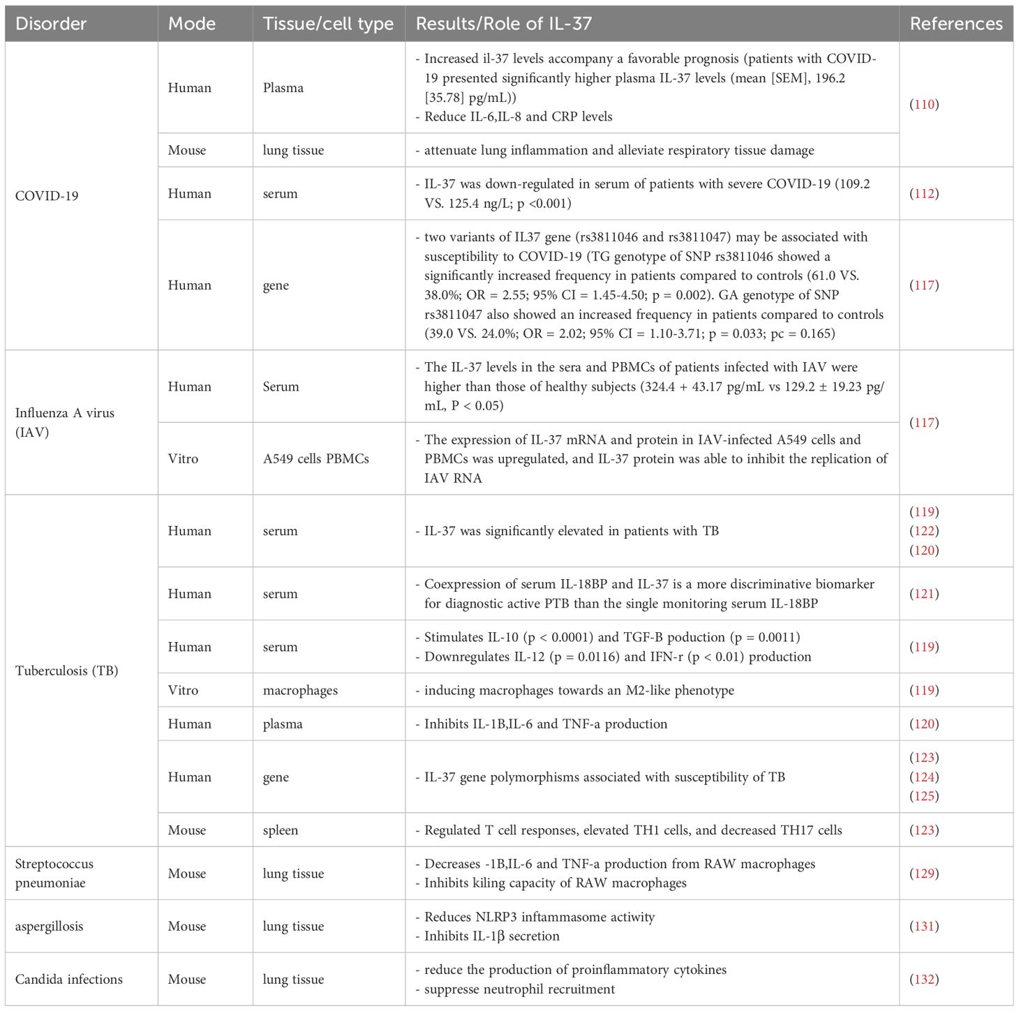 Tuberculosis (TB) is the leading cause of death from infectious diseases globally, especially in developing and least-developed countries. The most frequently afflicted organ in a TB infection is the lung. Pulmonary TB (PTB) is correlated with higher rates of mortality and morbidity. Early detection of PTB is critical for lowering mortality (118). In patients with active tuberculosis (ATB), serum levels of IL-37 are elevated. A 2015 study indicated that prior to a six-month course of standard anti-TB drug therapy with rifampicin, isoniazid, pyrazinamide, and ethambutol, ATB patients had significantly higher serum IL-37 levels and mRNA expression compared to post-treatment patients or healthy individuals (119). Similarly, Zhang et al. (120) discovered that individuals with ATB had significantly higher levels of IL-37 plasma than healthy controls and that IL-37 plasma levels were lowered after antituberculosis medication. Several follow-up investigations verified the considerable elevation of IL-37 levels in patients with PTB. Wawrocki et al. (121) observed that co-expression of serum IL-37 and IL-18BP was a more discriminating biomarker for the diagnosis of active PTB than serum IL-18BP alone. Furthermore, Yu et al. (122) observed overexpressed IL-37, TNF-ɑ, and miR-155 levels in elderly patients with active PTB. The simultaneous assessment of serum IL-37/TNF-ɑ/miR-155 expression holds promise as a diagnostic modality for identifying active PTB in older individuals. These data imply that IL-37 plays an important role in the course of PTB. IL-37 levels are considered an indicator of recovery and a new biomarker for the identification and diagnosis of ATB.