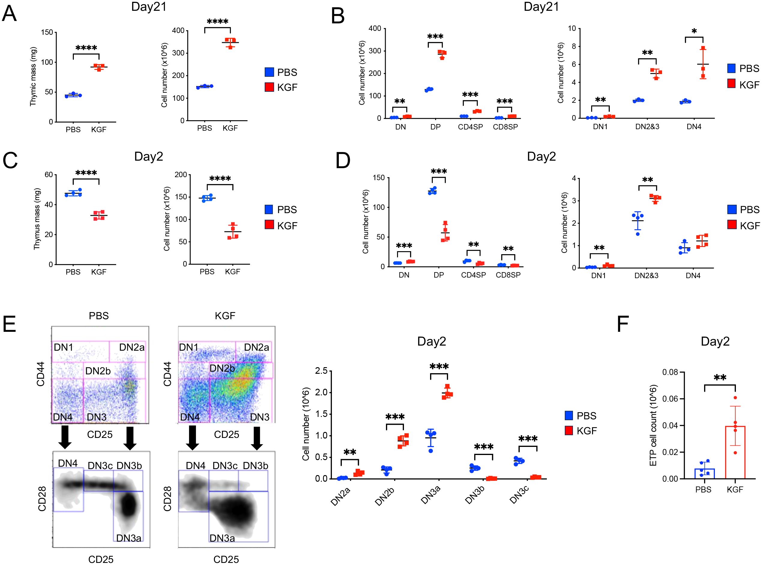 Figure 1. Exogenous KGF treatment alters thymocyte development and cellularity in adult thymus. (A) Thymus mass and thymocyte cellularity of PBS- and KGF-treated mice were assessed on day 21 following three consecutive daily doses (0.5mg/kg). (B) Absolute cell numbers of CD4-CD8-double negative (DN), CD4+CD8+double positive (DP), CD4+ single positive (CD4SP) and CD8+ single positive (CD8SP) thymocyte subsets (left), as well as DN1, DN2/3, and DN4 subsets (right) were quantified by flow cytometry in PBS- (blue) and KGF-treated (red) mice. (C) Thymus mass and thymocyte cellularity were evaluated on day 2 after three consecutive daily doses of KGF or PBS. (D) Absolute cell numbers of DN, DP, CD4SP, and CD8SP thymocyte subsets (left), along with DN1, DN2/3, and DN4 subsets (right), were assessed by flow cytometry on day 2 post-treatment. (E) Representative flow cytometry plots showing gateing strategies for identifying DN subpopulations and corresponding absolute thymocyte counts in PBS- (blue) and KGF-treated (red) mice at day 2 post-treatment. (F) Comparison of ETP cell number between PBS- and KGF-treated mice at day 2 post-treatment. Data in (A, B) are representative of three independent experiments; data in (C–F) are representative of more than three independent experiments. All data are presented as mean ± SD. Error bars indicate the standard deviation. Statistical significance was determined by unpaired two-tailed Student’s t-test: *p<0.05; **p<0.01; ***p<0.001; ****p<0.0001.