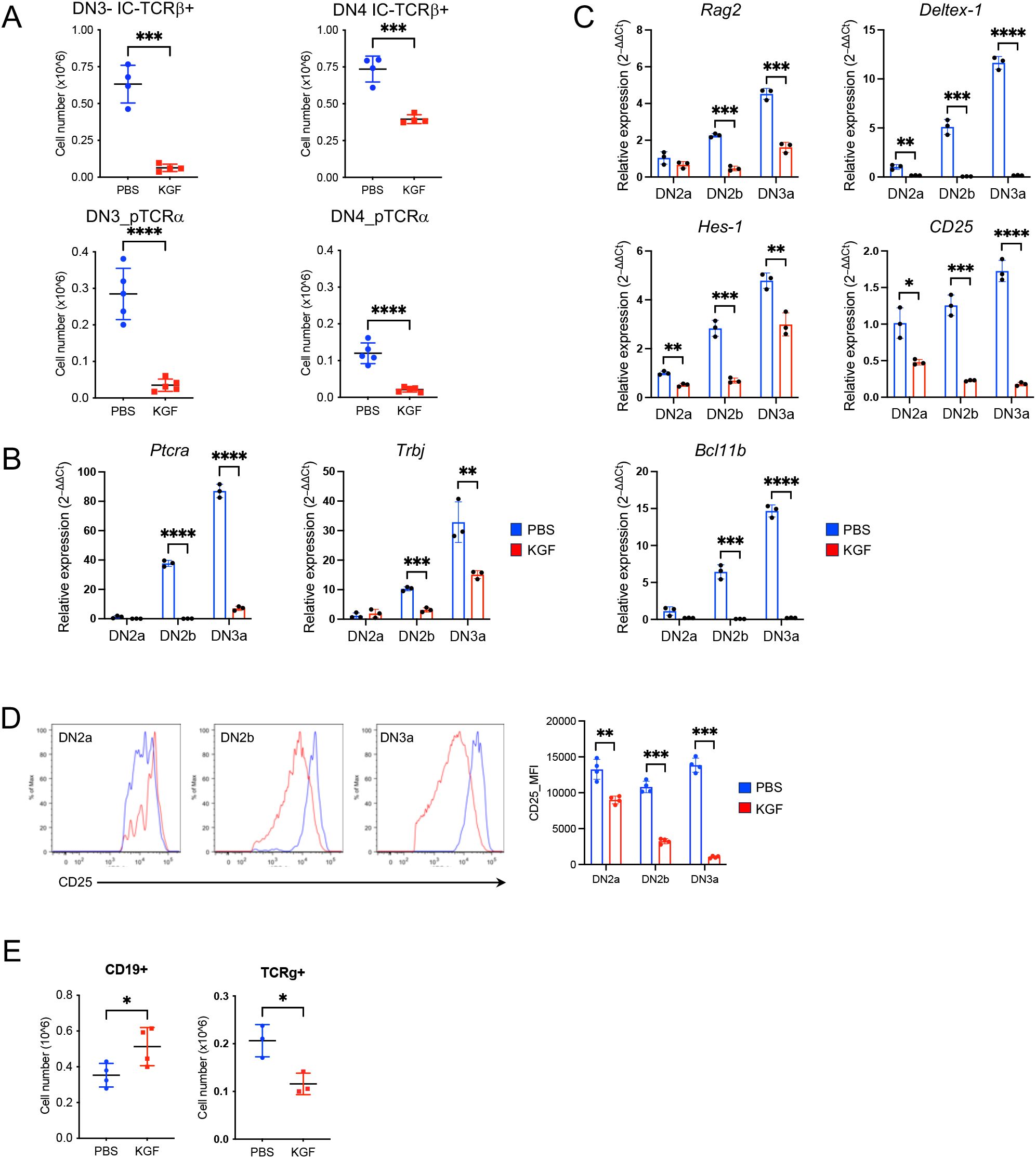 Figure 2. KGF inhibits pre-TCR expression and suppresses Bcl11b activation in DN thymocytes prior to β-selection. (A) Expression of TCRβ (n=4) and pre-TCRα (n=5) in DN3 and DN4 thymocyte subsets was assessed by flow cytometry on day 2 following PBS or KGF treatment. (B, C) mRNA levels of Ptca and Trbj genes (B), as well as Rag2, Deltex-1, Hes-1, CD25, and Bcl11b (C) were measured in sorted DN2a to DN3a subsets from PBS- (blue) and KGF-treated (red) mice using TaqMan gene expression assays. Data represent 3 independent experiments. (D) Cell surface CD25 expression on DN2a, DN2b, and DN3a subsets was quantified by flow cytometry using mean fluorescence intensity (MFI); representative histograms from four independent experiments are shown. (E) Numbers of B and TCRγ+ cells in PBS- (blue) and KGF-treated mice (red) (n=3-4) were quantified by flow cytometry on day 2 post-treatment. Data are presented as mean ± SD. Error bars indicate standard deviation. Statistical significance was determined using unpaired two-tailed Student’s t-test: *p<0.05; **p<0.01; ***p<0.001; ****p<0.0001.