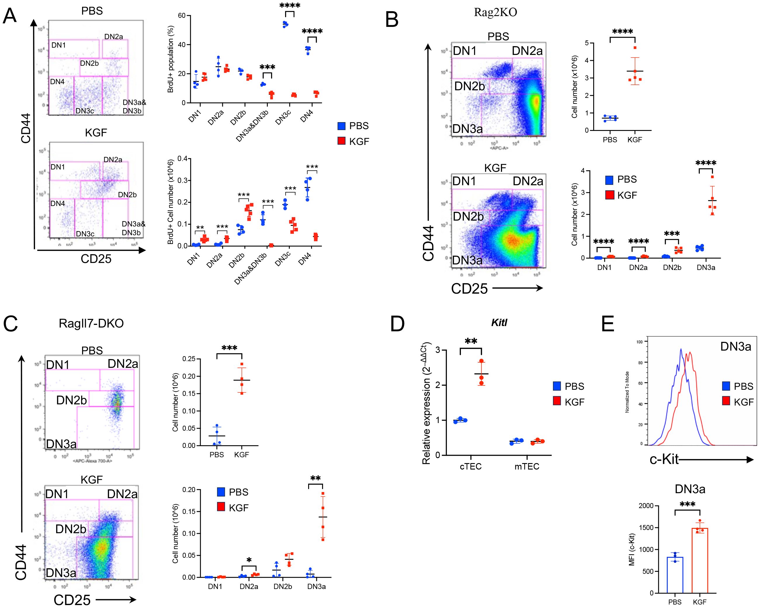 Figure 3. KGF treatment is associated with an expansion of pre-β-selection thymocytes. (A) The entry of DN thymocyte populations into S-phase of the cell cycle was assessed 2 hours after BrdU administration in PBS- (blue, n=4) and KGF-treated (red, n=5) mice (day 2 post-treatment). BrdU+ DN subsets were analyzed based on their CD44 and CD25 expression profiles (left). The frequencies (top right) and absolute numbers (bottom right) of BrdU+ thymocytes within each DN subset are shown. (B) DN thymocyte subsets in Rag2−/− mice (Rag2KO) were analyzed based on CD44 and CD25 expression profiles on day 2 following PBS or KGF treatment (n=5) (left); and total thymocyte numbers and absolute counts of all DN subsets are presented (right). (C) DN subpopulations in Rag−/−Il7−/− (RagIl7-DKO) mice (n=4) were analyzed on day 2 following three consecutive doses of PBS (blue) or KGF (red). Representative CD44/CD25 FACS plots of DN thymocytes (left), along with absolute numbers of total DN thymocytes (top right) and individual DN subsets (bottom right) are shown. (D) Kitl mRNA levels were quantified in sorted cTECs and mTECs from PBS- (blue) and KGF- (red) treated wild-type mice. (E) Cell surface expression of c-Kit in DN3a thymocytes from PBS- (blue) and KGF-treated (red) mice was evaluated by flow cytometry. Representative histograms (top) from three independent experiments and MFI (bottom) are shown. Data represent the mean of three independent experiments and are presented as mean ± SD. Error bars represent standard deviation. Statistical significance was determined using unpaired two-tailed Student’s t-test: *p<0.05; **p<0.01; ***p<0.001; ****p<0.0001.