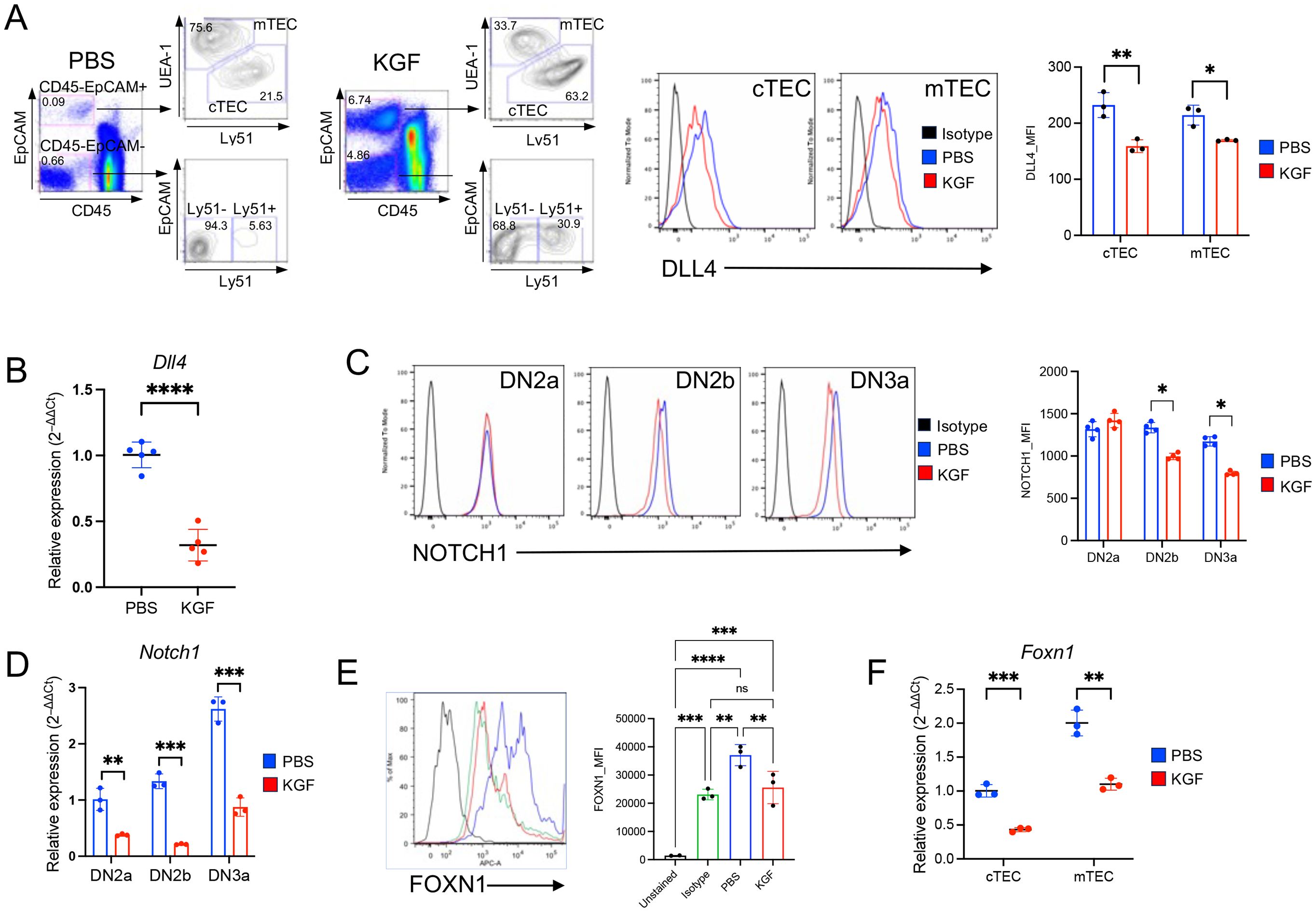 Figure 4. KGF reduces expression of DLL4 and its upstream transcriptional regulator FOXN1 in both cTECs and mTECs. (A) Thymic stromal subsets were defined based on EpCAM, Ly51, and UEA-1 expression profiles among CD45- cells. Representative dot plots from PBS- and KGF-treated thymi (three independent experiments) are shown (left). EpCAM+ TECs were further subdivided into two major subsets: UEA-1+/Ly51− medullary TECs (mTECs) and UEA-1−/Ly51+ cortical TECs (cTECs). DLL4 expression in cTECs and mTECs from PBS- (blue) and KGF-treated (red) wild type mice was evaluated by flow cytometry; representative histograms (middle) and mean fluorescence intensity (MFI) values (right) are shown. Isotype staining is shown in black. (B) Dll4 mRNA levels were measured in total TECs from PBS- (blue) and KGF-treated (red) mice. Data from three independent experiments are presented. (C) Cell surface expression of Notch1 receptor in DN2a-DN3a early thymocyte subsets from PBS- (blue) and KGF-treated (red) mice was evaluated by flow cytometry. Isotype staining is shown in black. Representative histograms from four independent experiments are shown (left), and MFI for each subset are presented (right). (D) Notch1 mRNA levels in DN2a-DN3a thymocyte subsets from PBS- (blue) and KGF-treated (red) mice are shown. (E) Intracellular FOXN1 expression in TECs from PBS- (blue) and KGF-treated (red) mice was assessed by flow cytometry. Representative histograms are shown, including an unstained control (black line) and IgG2b isotype control (green line) (left). Quantification of FOXN1 expression in total TECs by MFI is based on three independent experiments. (F) Foxn1 mRNA levels in sorted TEC subsets from PBS- (blue) and KGF- treated (red) mice were also evaluated and quantitative results are shown. Data are presented as mean ± SD. Error bars indicate standard deviation. Statistical significance between two groups was determined using unpaired two-tailed t-tests. One-way ANOVA was applied for comparison of 3 and more groups and p-values were determined by Tukey’s multiple comparisons test: *p<0.05; **p<0.01; ***p<0.001; ****p<0.0001; ns = not significant.