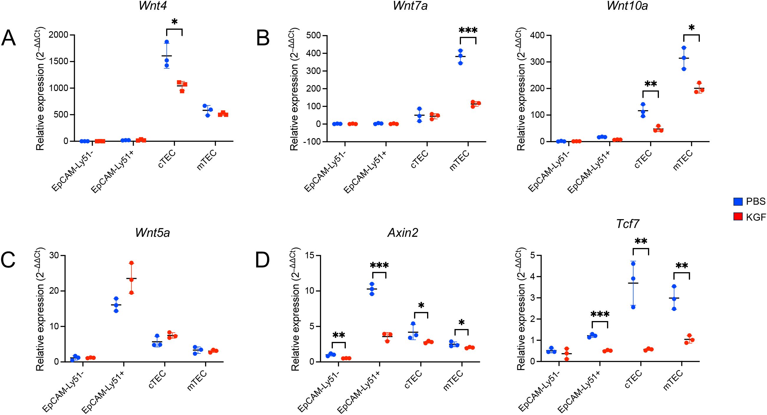 Figure 5. KGF suppresses Wnt/β-catenin signaling and reduces Wnt ligand expression in TECs. Expression of Wnt ligands Wnt4 (A), Wnt7a and Wnt10a (B), Wnt5a (C), and Wnt/β-catenin signaling target genes Axin2 and Tcf7 (D) were evaluated by Taqman gene expression assays in sorted thymic stromal subsets from PBS- (blue, n=3) and KGF-treated (red, n=3) mice; EpCAM-Ly51- (Endothelial), EpCAM-Ly51+ (Mesenchymal), cTEC (EpCAM+UEA-1−/Ly51+) and mTEC (EpCAM+UEA-1+/Ly51−). Data are presented as mean ± SD. Error bars represent the standard deviation from three independent experiments. Statistical significance was determined using an unpaired two-tailed Student’s t-test: *p<0.05; **p<0.01; ***p<0.001.