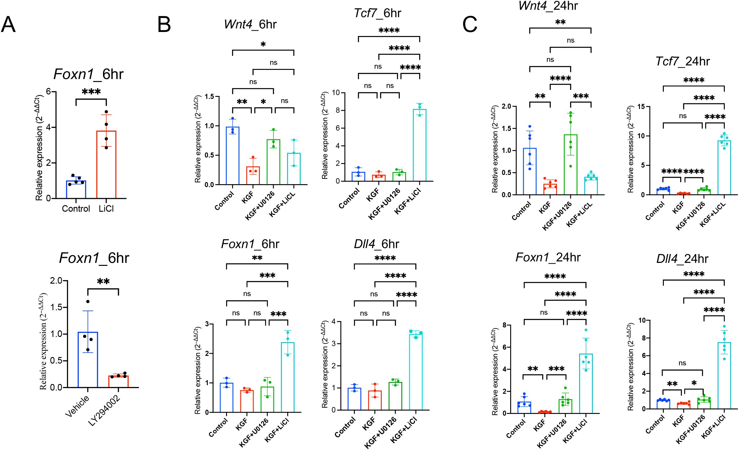 Figure 6. KGF regulates Foxn1 expression in TECs through Wnt/β-catenin signaling. (A) Effect of LiCl and LY294002 on Foxn1 transcription in TE-71 cells. Data represent four experimental replicates. (B) Expression of the Wnt ligands Wnt4, Foxn1, Dll4 and Wnt/β-catenin signaling target gene Tcf7, was assessed in TE-71kgfr cells cultured for 6 hours with vehicle control (blue), KGF (red), KGF+U0126 (green), or KGF+LiCl (cyan). Data represent three experimental replicates. (C) Gene expression was evaluated under the same conditions as in (B) after 24 hours of culture. Data represent six experimental replicates. All data are presented as mean ± SD. Error bars indicate the standard deviation. Statistical significance for (A) was determined using an unpaired two-tailed Student’s t-test: **p<0.01; ***p<0.001. For (B, C), one-way ANOVA followed by Tukey’s multiple comparisons test was used: *p<0.05; **p<0.01; ***p<0.001; ****p<0.0001; ns = not significant.