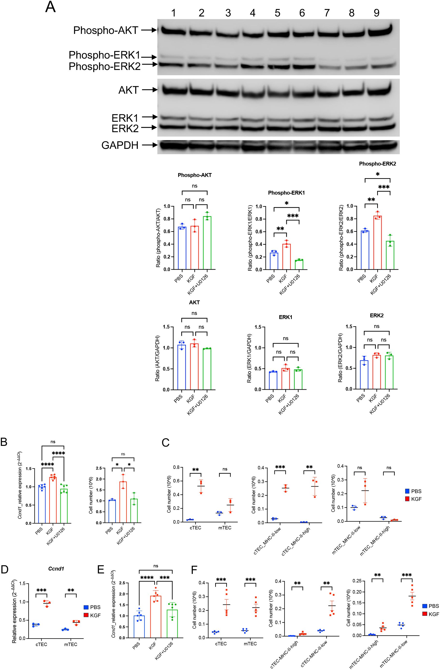 Figure 7. KGF promotes proliferation of TE-71 cells and primary TECs through activation of the MAPK/ERK signaling pathway. (A) Phosphorylation of AKT (Ser473) and ERK1/2 (Thr202/Tyr204) was evaluated in TE-71kgfr cells cultured for 6 hours with vehicle (blue), KGF (red), and KGF+U0126 (green). Representative immunoblots from three independent experiments are shown: lanes 1-3 (vehicle), lanes 4-6 (KGF), and lanes 7-9 (KGF+U0126) (top). Quantification of band intensities is presented (bottom). (B) Cyclin D1/Ccnd1 mRNA levels (left) and total cell numbers (right) were analyzed in TE-71kgfr cells cultured with vehicle (blue), KGF (red), or KGF+U0126 (green) for 72 hours. (C) Absolute numbers of cTECs and mTECs (left), MHC-IIhigh and MHC-IIlow cTECs (middle), and MHC-IIhigh and MHC-IIlow mTECs (right) were compared between PBS-treated (blue, n=3) and KGF-treated (red, n=3) wild-type mice on day 2 following three consecutive daily doses. (D) Ccnd1 expression in sorted cTEC and mTEC populations from PBS- (blue, n=3) and KGF-treated (red, n=3) mice [as in (C)] is shown. (E) Ccnd1 expression levels were evaluated in thymic fragments cultured with vehicle, KGF, and KGF+U0126 for 24 hours. Data represent three independent experiments. (F) TEC numbers in PBS-treated (blue, n=5) and KGF-treated (red, n=5) mice were assessed 6 weeks after three consecutive doses of treatment. Cell numbers of cTEC and mTEC (left), MHC-IIhigh and MHC-IIlow cTEC (middle), MHC-IIhigh and MHC-IIlow mTEC (right) are shown. Data are presented as mean ± SD. Error bars indicate standard deviation. Statistical significance for comparisons between two groups was determined using an unpaired two-tailed Student’s t-test (**p<0.01; ***p<0.001). For comparisons among three different conditions, one-way ANOVA followed by Tukey’s multiple comparisons test was used: *p<0.05; ***p<0.001; ****p<0.0001; ns, not significant. Full-length, uncropped blots corresponding to those in panel (A) are provided in Supplementary Figures S8, S9.