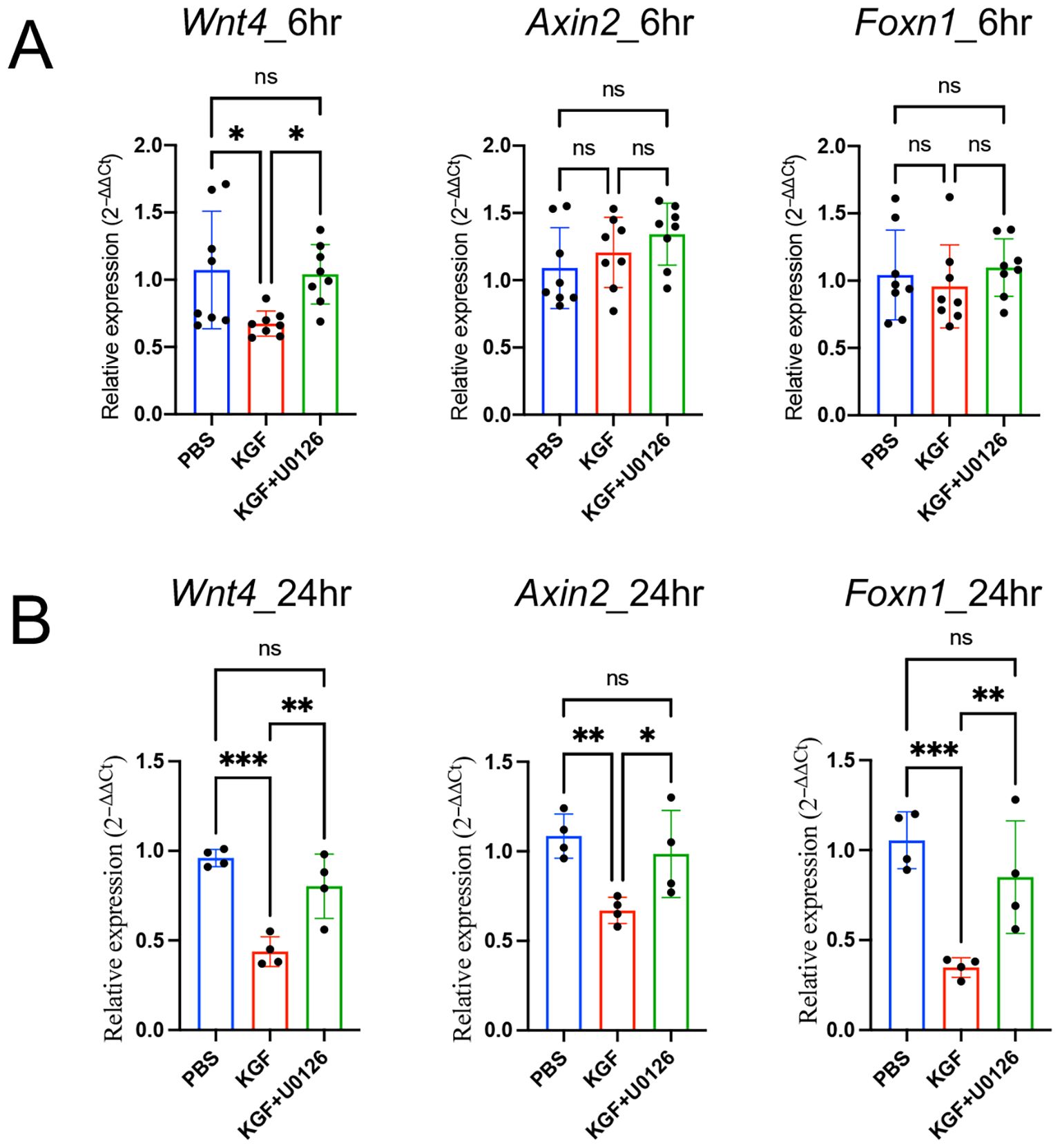 Figure 8. KGF regulates Foxn1 expression in thymic fragments through Wnt/β-catenin signaling. (A, B) Expression of the Wnt ligand Wnt4 and Wnt/β-catenin target genes Axin2 and Foxn1 was assessed in thymic fragments cultured with vehicle (blue), KGF (red), and KGF+U0126 (green) for 6 hours (A) and 24 hours (B). Data are presented as mean ± SD. Error bars represent standard deviation. Statistical significance for comparisons among the three culture conditions was determined by one-way ANOVA followed by Tukey’s multiple comparisons test: *p<0.05; **p<0.01; ***p<0.001. ns, not significant.