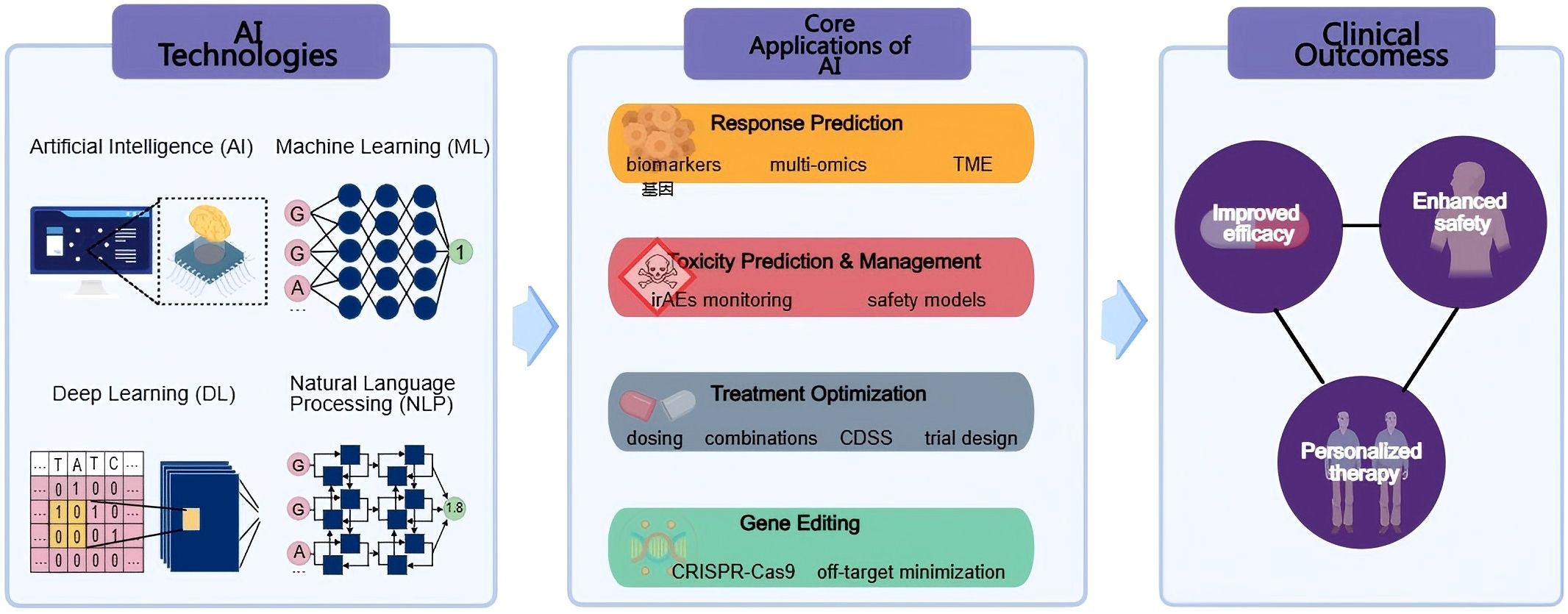 Figure 1. Overview of AI applications in cancer immunotherapy. The schematic illustrates how AI technologies, including Artificial Intelligence (AI), Machine Learning (ML), Deep Learning (DL), and Natural Language Processing (NLP)—support four core application areas: response prediction, toxicity prediction and management, treatment optimization, and gene editing. These applications collectively contribute to improved efficacy, enhanced safety, and personalized therapy in clinical cancer immunotherapy.
