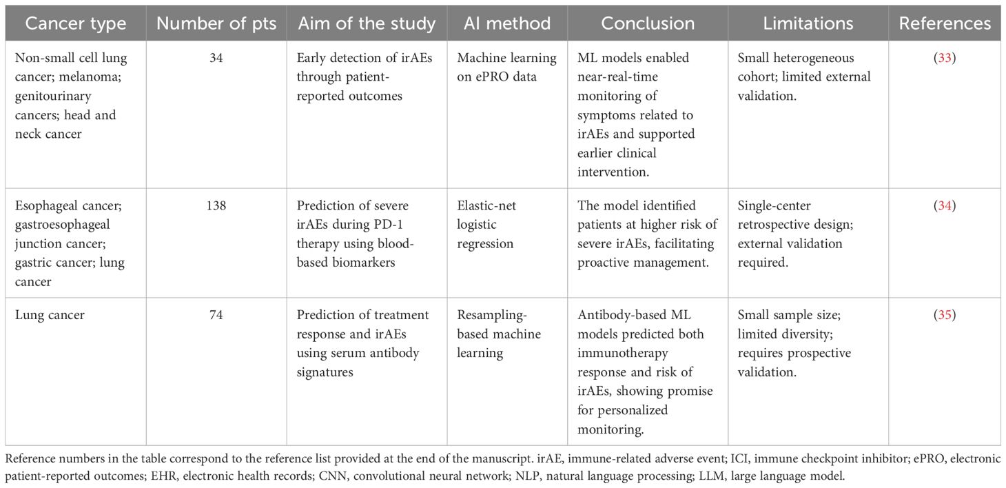 Recent studies have emphasized that predictive biomarkers are pivotal for linking AI models to both treatment response and safety monitoring in immunotherapy. Researchers have highlighted that biomarkers such as PD-L1 expression, tumor mutational burden (TMB), microsatellite instability (MSI), peripheral blood indices including neutrophil-to-lymphocyte ratio (NLR) and lactate dehydrogenase (LDH), circulating tumor DNA, and gut microbiota are not only predictive of ICI efficacy but also associated with immune-related toxicities (37). AI-driven approaches can integrate these multidimensional biomarkers into unified models, capturing complex non-linear associations beyond the capacity of traditional methods. By combining genomic, serological, and microbiome features, machine learning frameworks enable simultaneous identification of likely responders and early detection of patients at high risk for severe irAEs. Furthermore, emerging deep learning strategies that correlate radiomics and digital pathology with biomarker signatures further bridge efficacy prediction and toxicity monitoring, providing clinicians with actionable tools to balance therapeutic benefit and safety in real-world practice. Several studies have evaluated AI-based models for irAE prediction or detection in clinical settings (Table 1).