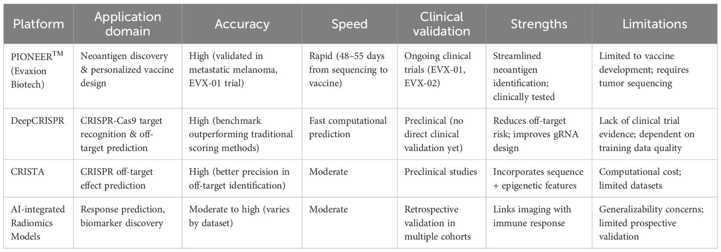 (Table 2) provides a comparative overview of representative AI platforms, highlighting differences in accuracy, speed, and clinical validation, which may guide their application in cancer immunotherapy.