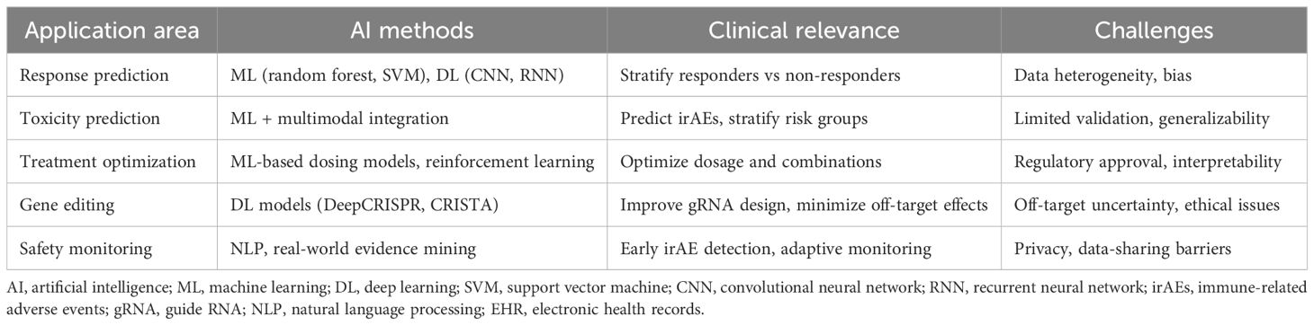 AI-assisted dynamic treatment adjustments and long-term efficacy monitoring represent another frontier in personalized immunotherapy (Table 3). By utilizing machine learning algorithms, clinicians can analyze vast datasets to predict patient responses to specific therapies, enabling adaptive treatment strategies that evolve based on real-time patient data. For example, AI can help identify optimal dosing regimens and timing for gene editing interventions, thereby maximizing therapeutic efficacy while minimizing adverse effects. Additionally, AI-driven predictive models can facilitate the monitoring of long-term treatment outcomes, allowing for timely modifications to therapy based on patient-specific responses. This is particularly relevant in the context of immunotherapy, where the heterogeneity of tumor responses necessitates a flexible and responsive treatment framework. Recent advancements in AI have demonstrated the capability to integrate clinical, genomic, and treatment data to refine patient stratification and improve the precision of immunotherapeutic interventions (9).