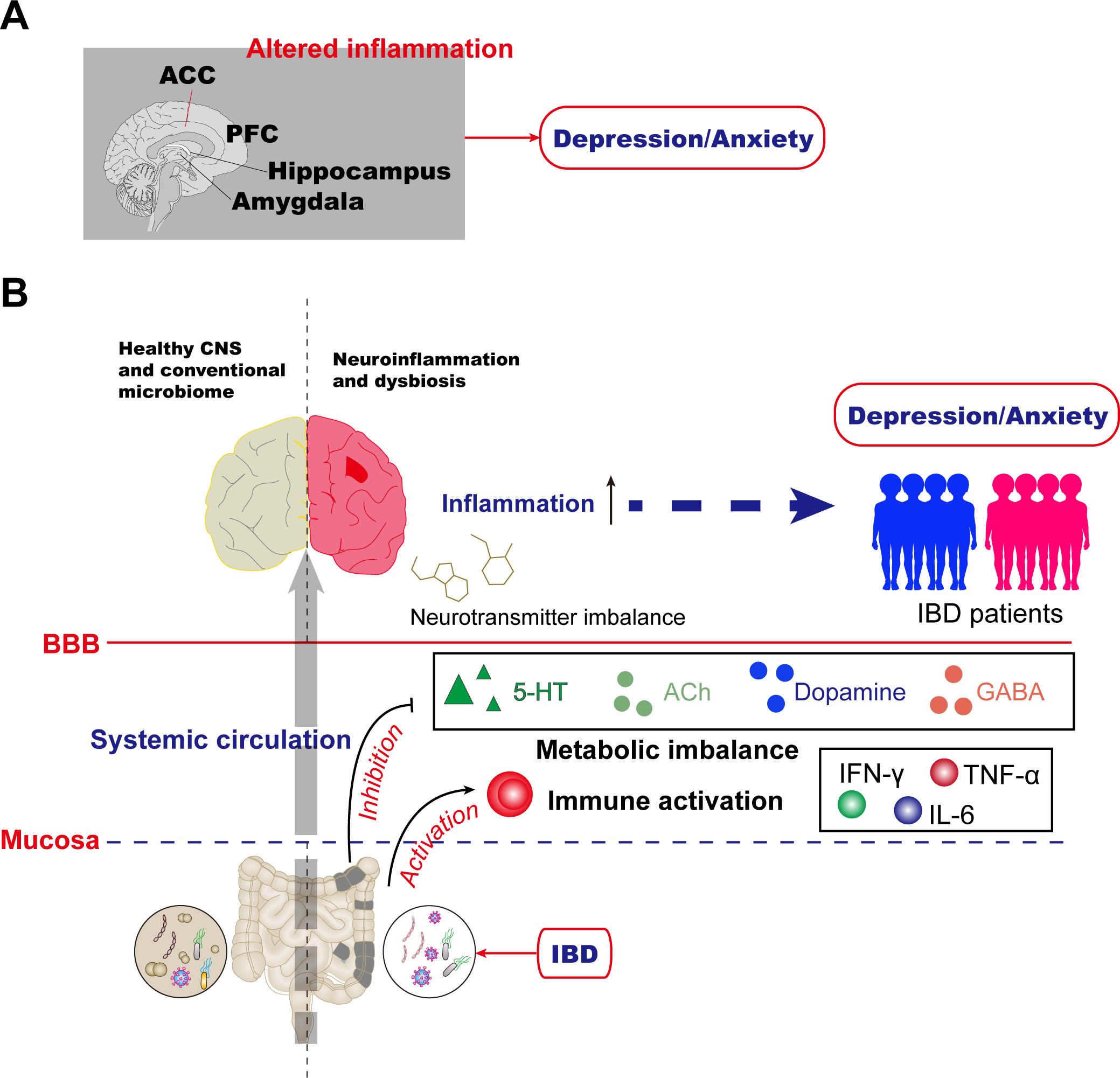 Figure 1. Mechanisms for anxiety and depression in inflammatory bowel disease. (A) Altered inflammation in the PFC, anterior cingulate cortex (ACC), amygdala, hippocampus, and other brain areas has been reported in humans. (B) The gut microbiome is essential for host immune functions and actively regulates mental health through microbiota-derived components and metabolites such as indoxyl sulfate, ACh, and norepinephrine (NE). In IBD patients, aberrations in gut microbiota homeostasis, or dysbiosis, are a common comorbidity that can lead to changes in metabolic imbalance and immune activation, resulting in altered neurotransmitter, and neuroinflammation. Collectively, these changes orchestrate the depression/anxiety observed in gut-brain interactions during IBD disease.