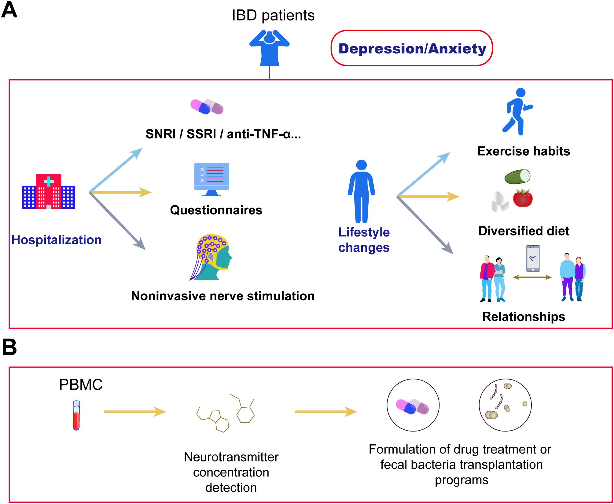 Figure 2. Cutting-edge therapies for depression and anxiety in IBD. (A) IBD patients with depression/anxiety can address symptoms through hospitalization or lifestyle adjustments. During hospitalization, symptoms improve via antidepressant/anxiolytic medications, questionnaire assessments, and non-invasive stimulation therapies. Lifestyle improvements include establishing regular exercise habits, adopting a diversified diet, and expanding social networks. (B) Blood neurotransmitter assays enable precise evaluation of depression/anxiety symptoms in IBD patients, facilitating targeted interventions. Examples include department-specific medication protocols to modulate neurotransmitter concentrations, and microbiota-targeted approaches (e.g., fecal microbiota transplantation or specialized formulations) that selectively modify gut microbiota structure to regulate neurotransmitter balance.