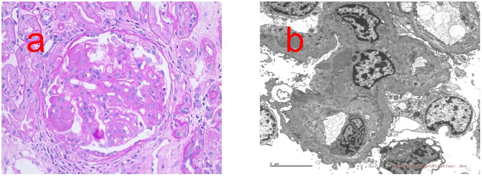Figure 1. Renal biopsy report. (a) PAS staining shows Diffuse spherical hyperplasia of glomerular mesangial cells and endothelial cells (×400). (b) Transmission electron microscope shows the podocytes of the visceral epithelial cells are fused, and electron-dense deposits can be seen under the endothelium and mesangial cells and stroma proliferate.
