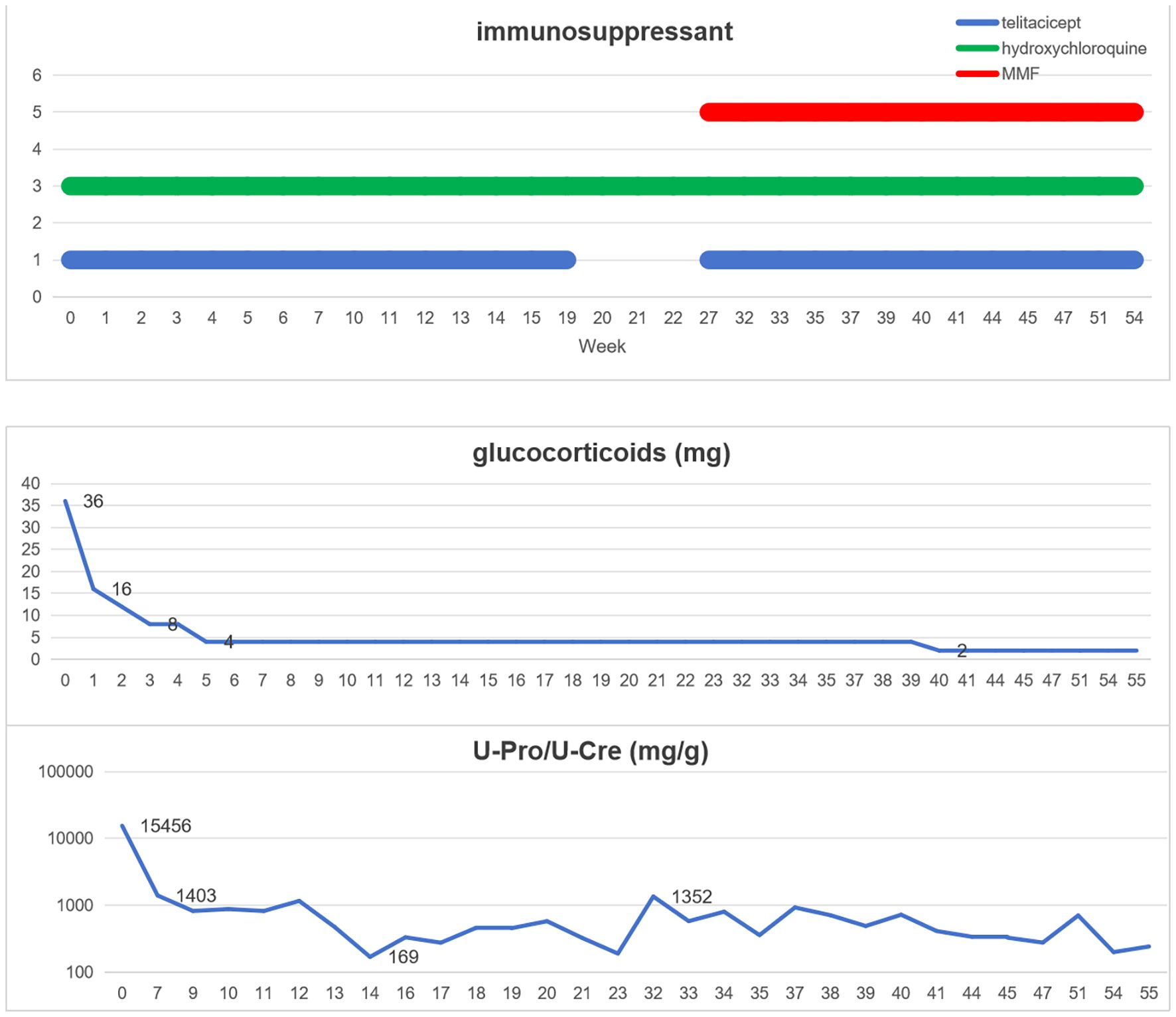 Telitacicept, 80 mg/160 mg ih (intramuscular injection) qw (once a week), was administered, and the dosage of methylprednisolone was reduced from 36 mg per day at the time of hospitalization to 16 mg and rapidly reduced to 4 mg within 5 weeks. After six weeks of telitacicept treatment, the urine protein/creatinine ratio significantly decreased from 15, 455 mg/g to 1, 403 mg/g, and after 12 weeks of treatment, it decreased to 169 mg/g. After 20 weeks of treatment, telitacicept was discontinued due to the patient’s economic factors. During this period, the monitored urine protein level gradually increased to 1, 352 mg/g. In the 27th week, methylprednisolone (4 mg) was continued and MMF was added in combination with telitacicept, 80/160 mg ih qw, for treatment. In week 40, methylprednisolone was adjusted to 4 mg orally every other day, and MMF was combined with telitacicept (80 mg ih q2w(twice a week)/qm (once a month).