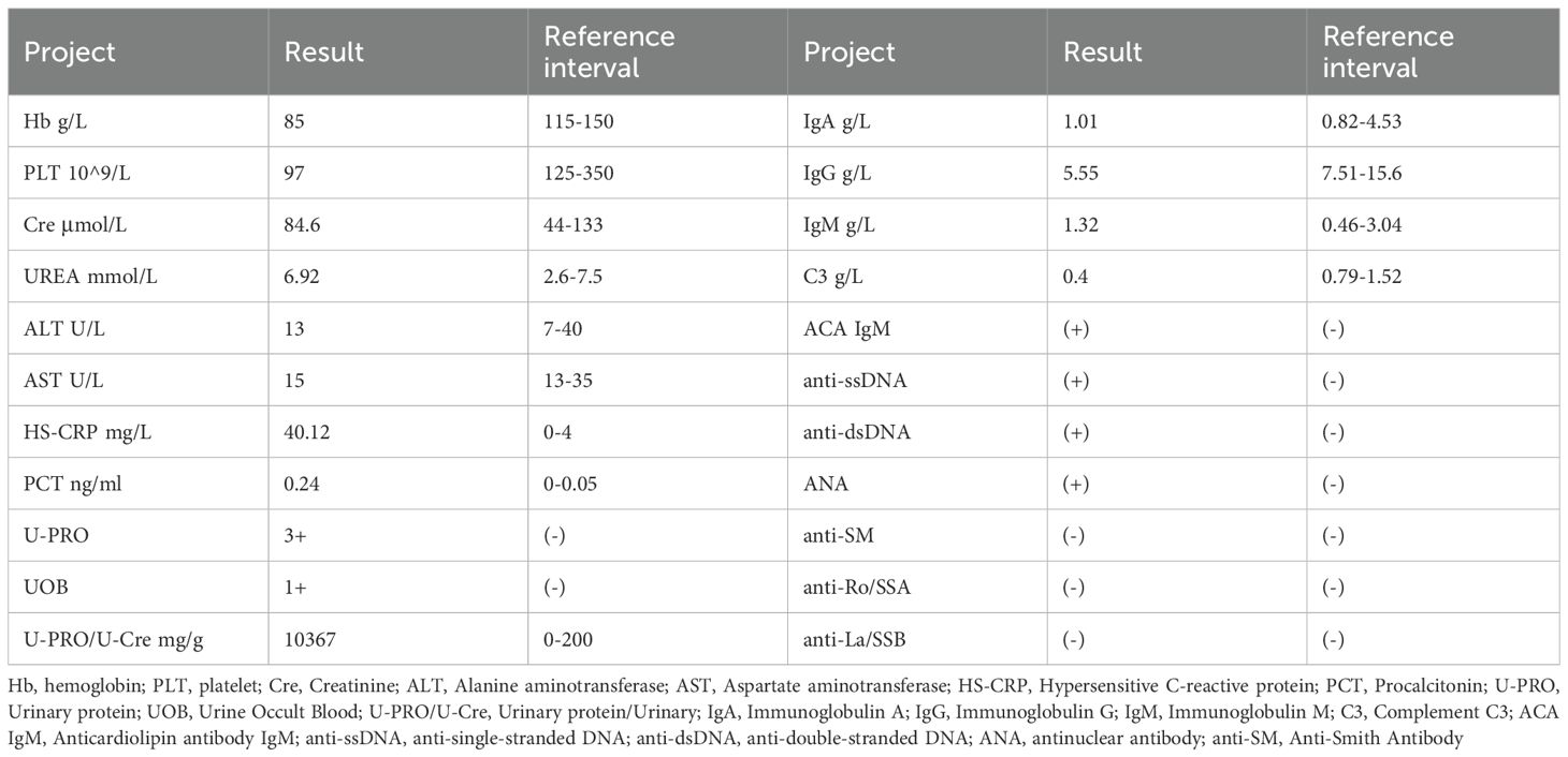 A 29-year-old woman was diagnosed with “LN” 15 years ago due to facial erythema, rash, and edema of both lower limbs. She had been treated with glucocorticoids and immunosuppressants, including cyclophosphamide (CTX), during which she was hospitalized in a local hospital for multiple recurrences or pulmonary infections, including five hospitalizations for severe pneumonia. The patient was admitted to the hospital this time due to “recurrent rash for 15 years, edema for 2 years, and aggravation for 1 month”. One month ago, the patient experienced swelling in both lower extremities again, which gradually worsened. It was accompanied by chest tightness after activity, coughing, and a small amount of white phlegm. After admission, the highest blood pressure was monitored at 181/127 mmHg. The blood pressure was controlled after the addition of levamlodipine and sacubitril valsartan sodium tablets. The patient underwent bilateral hip replacement due to bilateral femoral head necrosis five years ago. Menarche occurred at 13 years of age, with a menstrual cycle of 5 days (duration) and an interval of 28–30 days. Menstruation is regular, with moderate flow, normal color, and no dysmenorrhea. The results of the ancillary examinations are presented in Table 1.