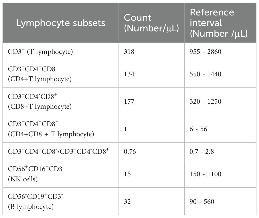 This case was a patient with recurrent LN with severe glucocorticoid complications, multiple previous severe pulmonary infections. The report results of the patient’s lymphocyte subsets showed that the patient had significantly low levels of T lymphocytes, B lymphocytes, and NK cells, suggesting that the patient had low innate and adaptive immunity (Table 2). At the same time, this patient also had elevated hypersensitive C-reactive protein, because he had pulmonary infection. After controlling the pneumonia infection through anti-infection treatment, considering the patient’s low immunity, we formulated a personalized treatment plan. The treatment plan and its efficacy are shown in Figure 2.