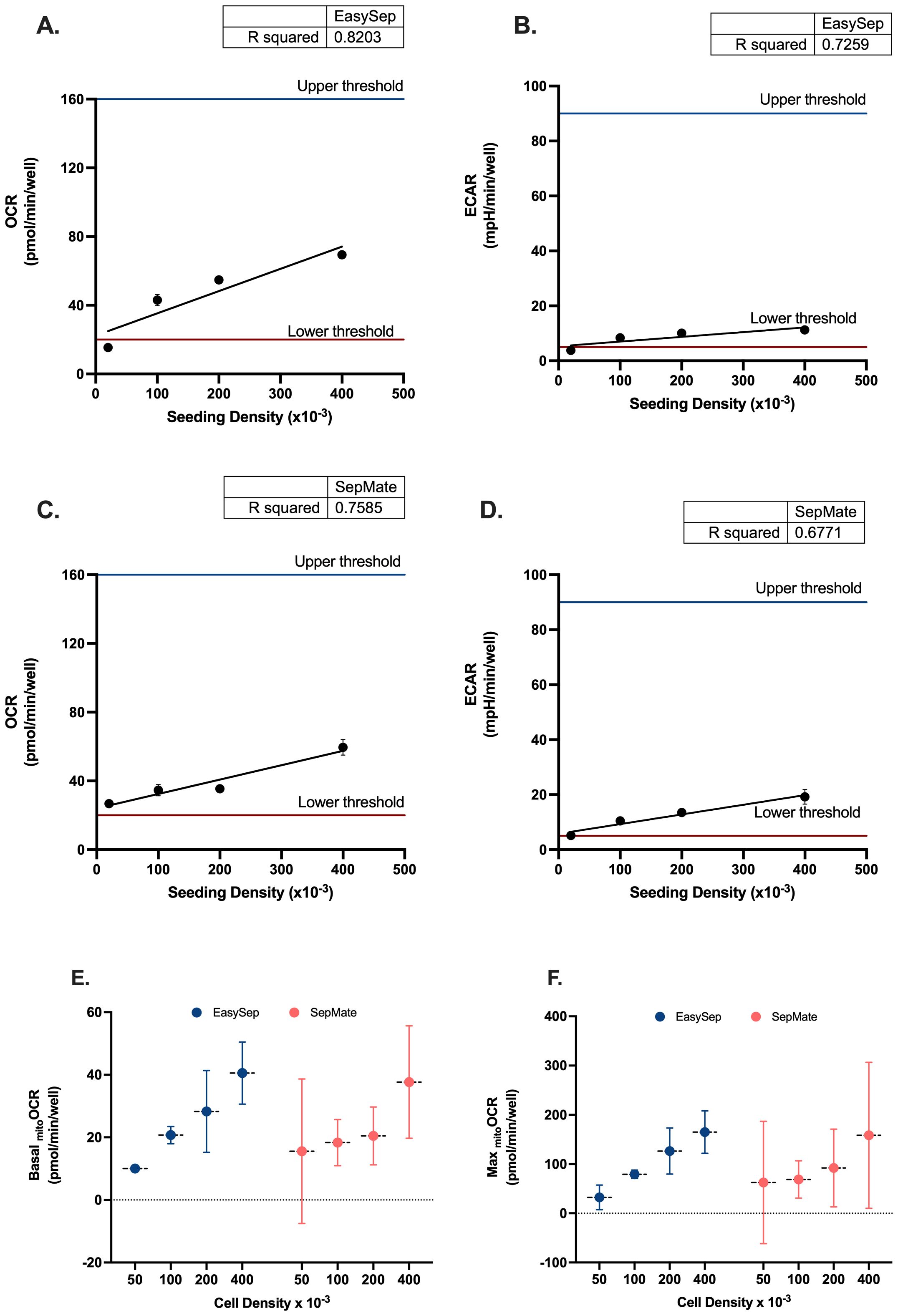 Figure 1. Seeding density optimisation for PBMC bioenergetic analysis using Seahorse XF technology. Linear regression analysis of oxygen consumption rate (OCR) versus seeding density for (A) EasySep™-isolated and (C) SepMate™-isolated PBMCs. Corresponding extracellular acidification rate (ECAR) analysis for (B) EasySep™ and (D) SepMate™ isolation methods. Upper and lower threshold lines indicate acceptable measurement ranges. Comparative analysis of (E) basal mitochondrial OCR and (F) maximal mitochondrial OCR across four seeding densities (50k, 100k, 200k, 400k cells/well) for both isolation methods. Data in panels A-D represent single experimental runs with 4–5 technical replicates per density. Data in panels E-F represent mean ± CV from three independent experiments with 6 experimental replicates each. Blue circles indicate EasySep™-isolated cells; red circles indicate SepMate™-isolated cells. R² values indicate goodness of fit for linear regression models. OCR and ECAR values are expressed as pmol/min/well and mpH/min/well, respectively.