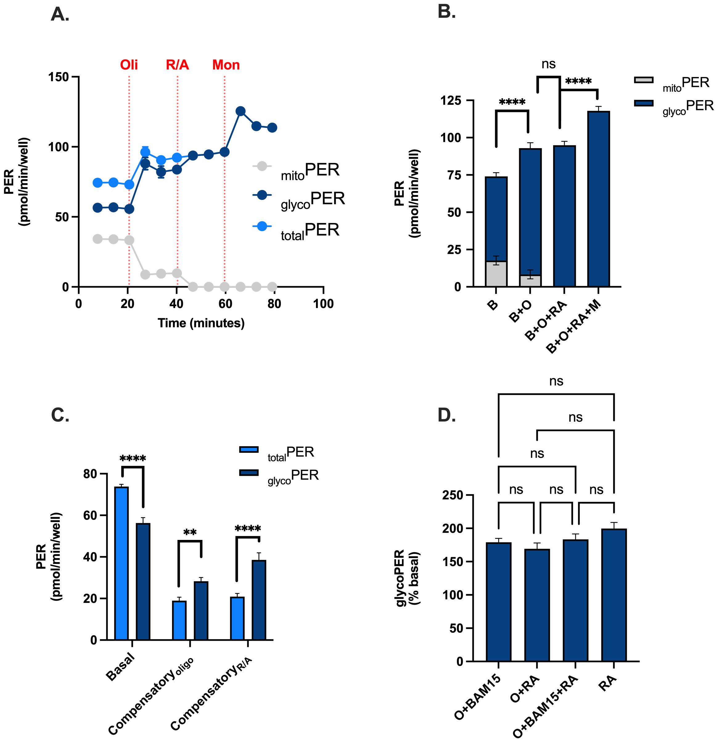 Figure 2. Feasibility of using a modified injection strategy for real-time metabolic profiling of PBMCs. PBMCs were assessed for OCR, PER, mitoPER and glycoPER in the presence and absence of the uncoupler BAM15, mitochondrial inhibitors (oligomycin or rotenone + antimycin A), and the ionophore monensin. (A) Kinetic traces of total PER (light blue circles), glycoPER (dark blue circles) or mitoPER (grey circles) following the sequential addition of respiratory effectors oligomycin, ronteone plus antimycin a and monensin. (B) Contributions of glycoPER (dark blue bars) and mitoPER (grey bars) from PBMCs in the presence of respiratory effectors. (C) Basal and compensatory PER (light blue bars) and glycoPER. (D) Respiratory effector-induced glycoPER (% basal). Data represent mean ± SEM from 3 technical replicates. Statistical differences were tested for by One-Way ANOVA with Tukey’s post-hoc test (**P < 0.01, ****P<0.0001), ns = not significant.