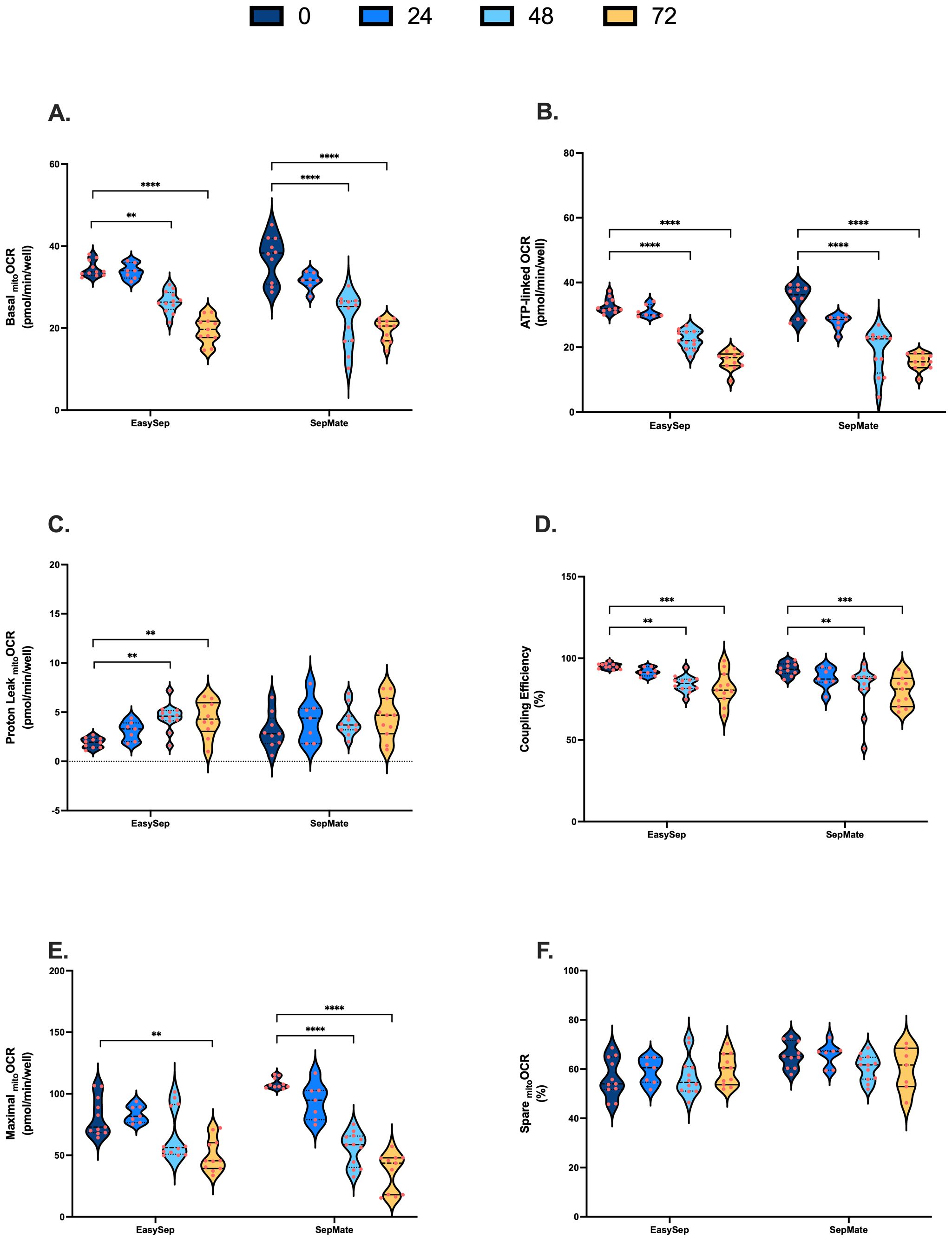 Figure 3. Impact of blood processing time and isolation method on PBMC mitochondrial energy metabolism. PBMCs isolated from 0-hour, 24-hour, 48-hour, or 72-hour rested blood using SepMate™ or EasySep™ Direct protocols were metabolically profiled in real-time using XF analysis to assess mitochondrial function. (A) Basal mitochondrial respiration (pmol O2/min/well). (B) Mitochondrial respiration (pmol O2/min/well) coupled to ATP synthesis. (C) Mitochondrial respiration (pmol O2/min/well) dissipated as heat due to proton leak. (D) Coupling efficiency of oxidative phosphorylation expressed as percent of baseline mitochondrial respiration. (E) Maximal mitochondrial respiratory (pmol O2/min/well) capacity. (F) Spare respiratory capacity presented as percentage of maximal mitochondrial respiratory capacity. Data represent means ± SEM from 8–12 technical replicates across three independent experiments. Statistical differences were tested for by Two-Way ANOVA with Dunnett’s post-hoc test (**P < 0.01, ***P < 0.001, ****P<0.0001).