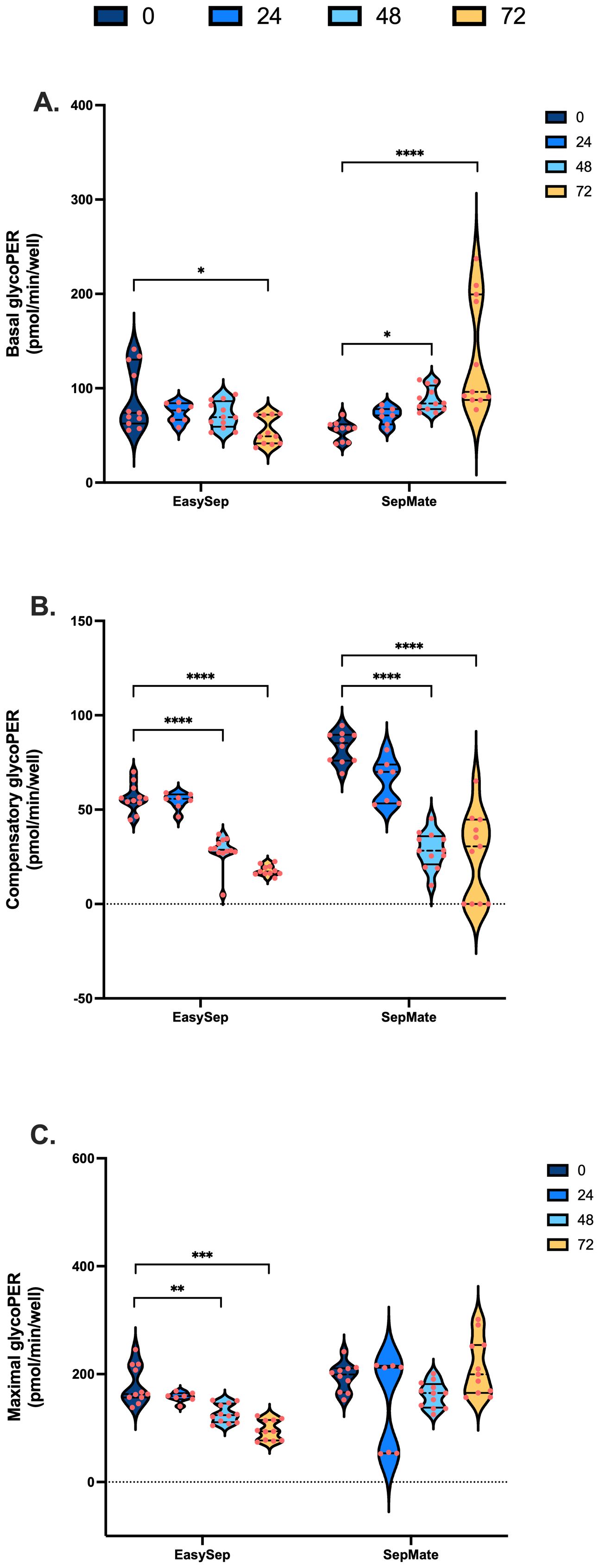 Figure 4. Impact of blood processing time and isolation method on PBMC glycolytic energy metabolism. PBMCs isolated from 0-hour, 24-hour, 48-hour, or 72-hour rested blood using SepMate™ or EasySep™ protocols were metabolically profiled to assess glycolytic function. (A) Basal glycolytic PER (pmol/min/well). (B) Oligomycin-induced compensatory glycolytic PER (pmol/min/well). (C) Maximal glycolytic PER (pmol/min/well) with monensin. Data represent means ± SEM from 8–12 technical replicates across three independent experiments. Statistical differences were tested for by Two-Way ANOVA with Tukey’s post-hoc test (**P < 0.01, ***P < 0.001, ****P<0.0001).