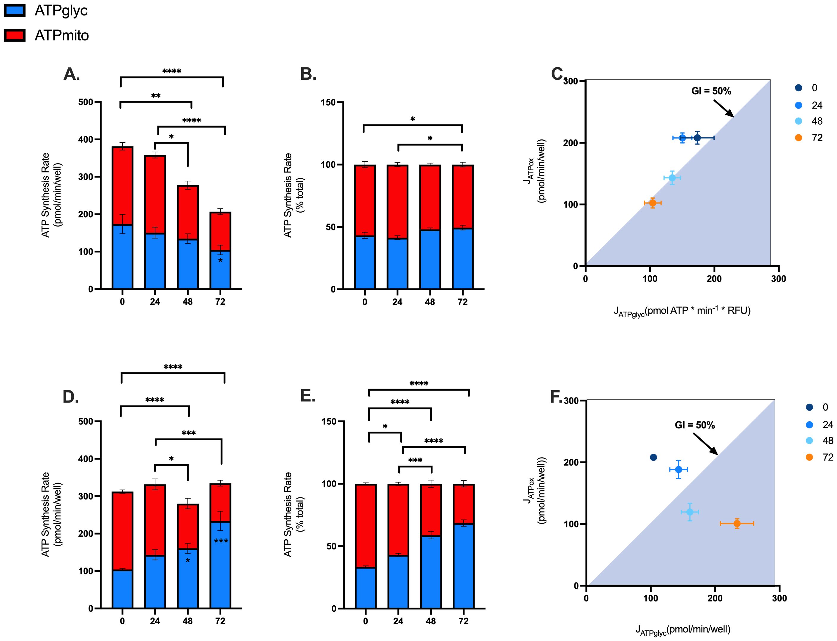 Figure 5. Effects of blood processing time and isolation method on PBMC ATP supply flux. Mitochondrial and glycolytic ATP supply rates were estimated from OCR and PER data using XF analysis. Mitochondrial (red fraction) and glycolytic (blue fraction) ATP synthesis rates from PBMCs isolated by EasySep Direct™ (A) or SepMate™ (D) at different blood processing times. Mitochondrial (red fraction) and glycolytic (blue fraction) ATP synthesis rates expressed as percentage of total ATP supply flux from PBMCs isolated by EasySep Direct™ (B) or SepMate™ (E) at different blood processing times. XY scatter graph of ATPmito (pmol/min/well) expressed as a function of ATPglyc (pmol/min/well) from PBMCs isolated by EasySep Direct™ (C) or SepMate™ (F). A glycolytic index (GI) calculated as 100 x ATPglyc/total ATP) of 50% or more denotes the threshold for a primarily glycolytic cell, points with a 50% GI or more lye within the blue shaded area (C, F). Data represent means ± SEM from 8–12 technical replicates across three independent experiments. Statistical differences were tested for by Two-Way ANOVA with Sidak’s post-hoc test (*P < 0.05, **P < 0.01, ***P < 0.001, ****P<0.0001).