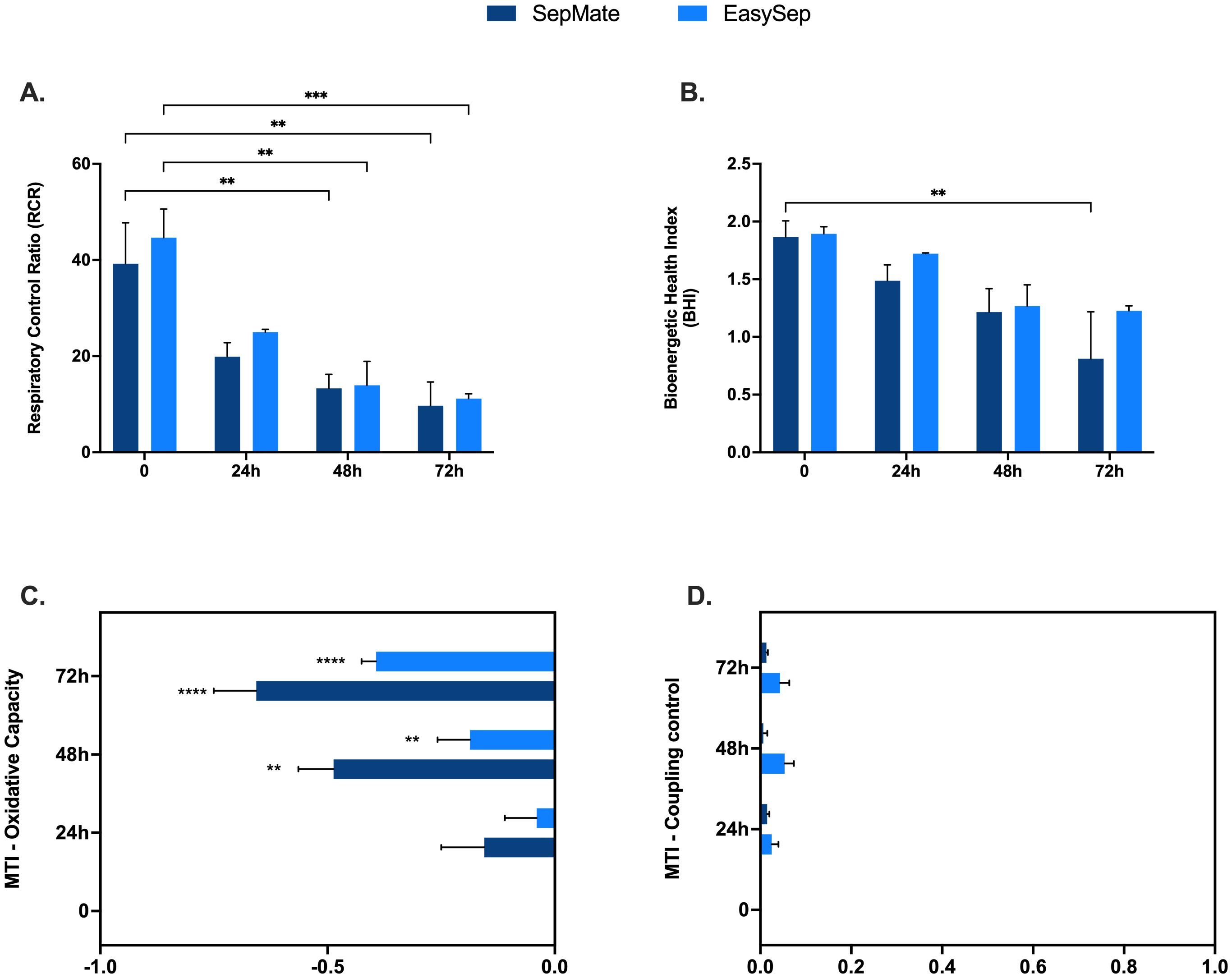 Figure 6. Mechanistic insights into effects of blood processing time on PBMC mitochondrial function. Advanced metabolic control analysis including respiratory control ratio (A), bioenergetic health index (BHI) and mitochondrial toxicity index c of PBMCs isolated from blood rested for 0hr, 24hr, 48hr or 72hr from different isolation method (EasySep™ or SepMate™). Data represent means ± SEM from 8–12 technical replicates across three independent experiments. Statistical differences were tested for by Two-Way ANOVA with Dunnett’s (A, B) or Tukey’s (C, D) post-hoc test (**P < 0.01, ***P < 0.001, ****P<0.0001).
