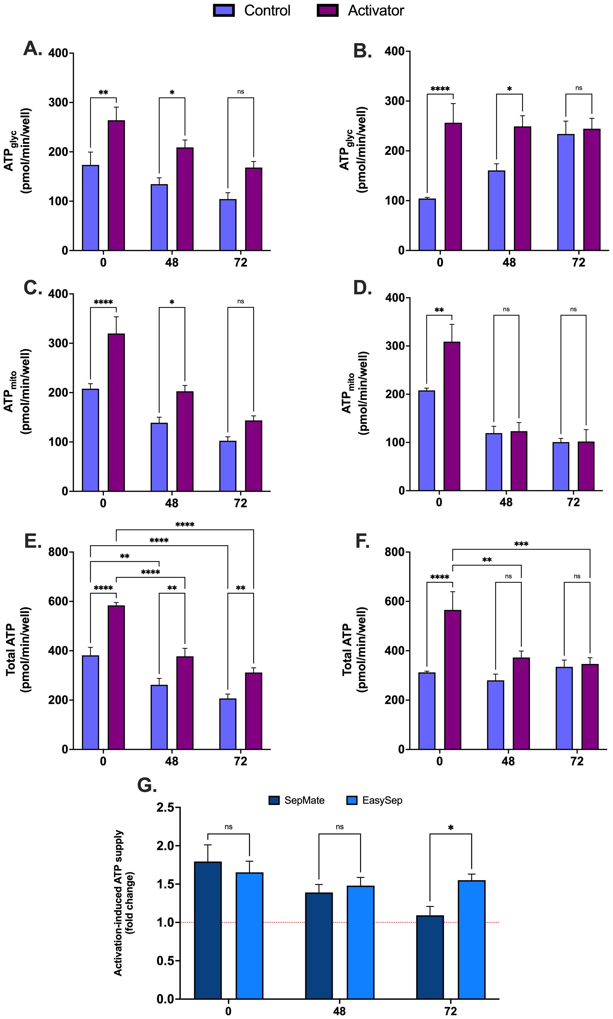 Figure 7. Effect of blood processing time and isolation method on metabolic changes during immune cell activation in PBMCs. Real-time metabolic activity was assessed in PBMCs isolated with EasySep™ direct or SepMate™ methods from whole blood at 0hr, 48hr or 72hr, and treated with (purple bars) or without (blue bars) CD3/CD28 immunocult T-cell activator. Glycolytic ATP supply from PBMCs ± CD3/CD28 immunocult T-cell activator isolated by EasySep Direct™ (A) or SepMate™ (B). Mitochondrial ATP supply from PBMCs ± CD3/CD28 immunocult T-cell activator isolated by EasySep Direct™ (C) or SepMate™ (D). Total ATP supply from PBMCs ± CD3/CD28 immunocult T-cell activator isolated by EasySep Direct™ (E) or SepMate™ (F). (G) Activation-induced ATP supply expressed as fold change from total ATP supply rate of PBMCs not treated with CD3/CD28 immunocult T-cell activator. Data represent means ± SEM from 8–12 technical replicates across three independent experiments. Statistical differences were tested for by Two-Way ANOVA with Sidak’s post-hoc test (*P < 0.05, **P < 0.01, ***P < 0.001, ****P<0.0001).