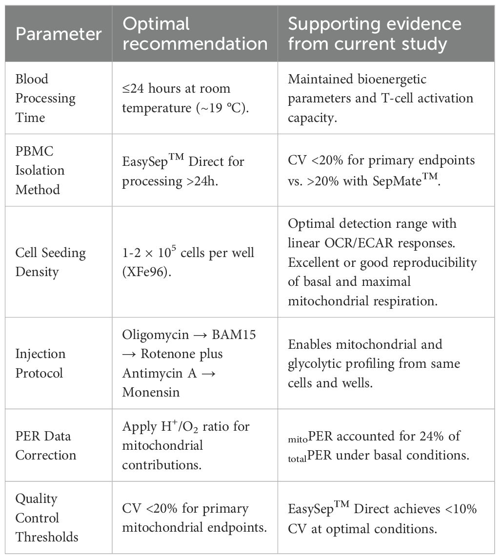 Results from the present study provide systematic evaluation of key factors influencing PBMC bioenergetic assessments using XF analysis. We confirmed a seeding density between 1x105-3x105 PBMCs per well for reproducible OCR and ECAR measurements, which is consistent with the literature (32–34). We also established a workflow with the sequential injection of oligomycin, BAM15 uncoupler, rotenone plus antimycin A and monensin to assess mitochondrial and glycolytic bioenergetic profiles of the same PBMCs (Figure 2). Our findings emphasise that blood processing time and isolation method significantly impact PBMC metabolism (Figures 3-5) and cell viability (Supplementary Figure S2). Prolonged blood storage (48–72 hours) at room temperature lowered mitochondrial function and increased glycolytic reliance, particularly in PBMCs isolated with the SepMate™ method, which were contaminated with red blood cells that confounded glycolytic measurements. Additionally, longer processing times led to impaired T cell activation capacity, highlighting the need for timely blood processing to preserve mitochondrial health. These insights have important implications for enhancing the accuracy, reproducibility, and reliability of metabolic assessments, particularly when profiling both mitochondrial and glycolytic flux of PBMCs using XF analysis.