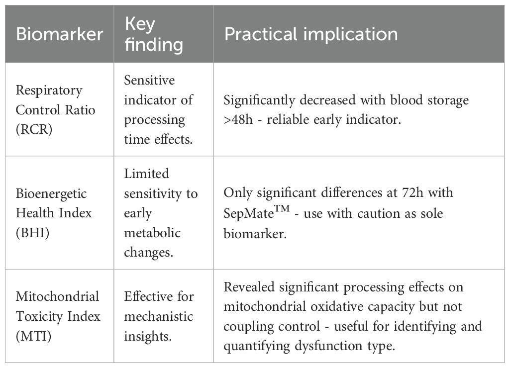 The differential sensitivity patterns observed between the BHI and more specific mitochondrial parameters (RCR and MTI) provide important insights into the clinical utility of these metrics in PBMC bioenergetic assessments. The BHI integrates reserve capacity, ATP-linked respiration, non-mitochondrial respiration, and proton leak to provide overall mitochondrial bioenergetic assessment (27). This composite metric has demonstrated clinical utility across diverse disease states including diabetic nephropathy, where reduced BHI values correlated with loss of metabolic flexibility (45), cardiovascular disease (20), cancer immunotherapy responses (46), metabolic disorders (22, 47), and Alzheimer’s disease (48). Our observation that BHI remained preserved until extended storage periods (72 hours) while RCR and MTI demonstrated changes at earlier time points (48 hours) reflects the idea that BHI identifies progressive deterioration before complete energetic failure occurs (27). This suggests that while individual parameters are more sensitive to acute mitochondrial stress, the integrated BHI measure detects sustained metabolic perturbations with greater clinical relevance. However, the inconsistent BHI response - being significantly affected only in PBMCs isolated from 72-hr rested blood using SepMate™ - raises concerns about its reliability in the context of pre-analytical variability and highlights the need for careful consideration of methodological factors in clinical implementation.
