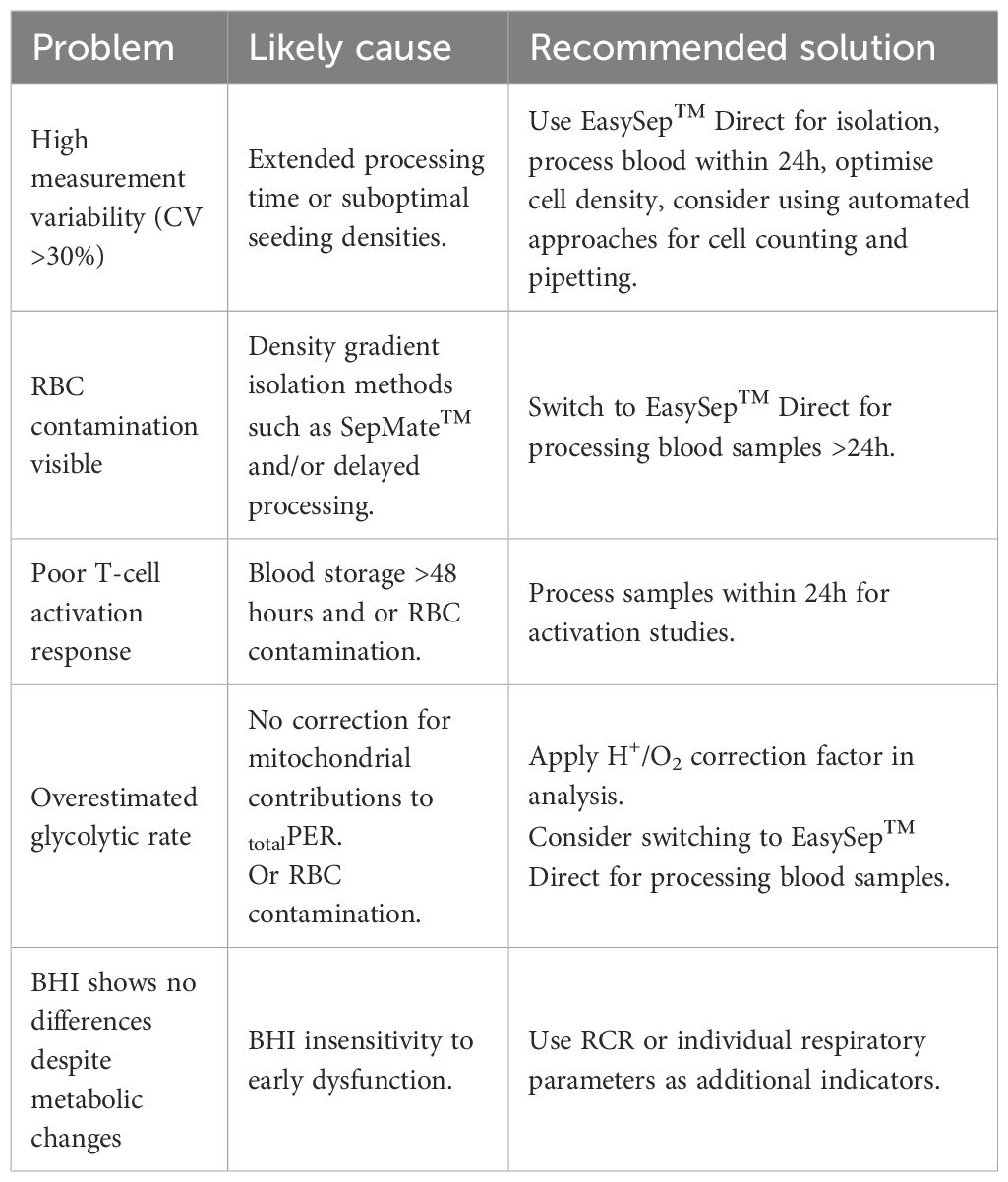 Table 3. Best practice recommendations for PBMC metabolic profiling based on experimental findings - troubleshooting common issues.