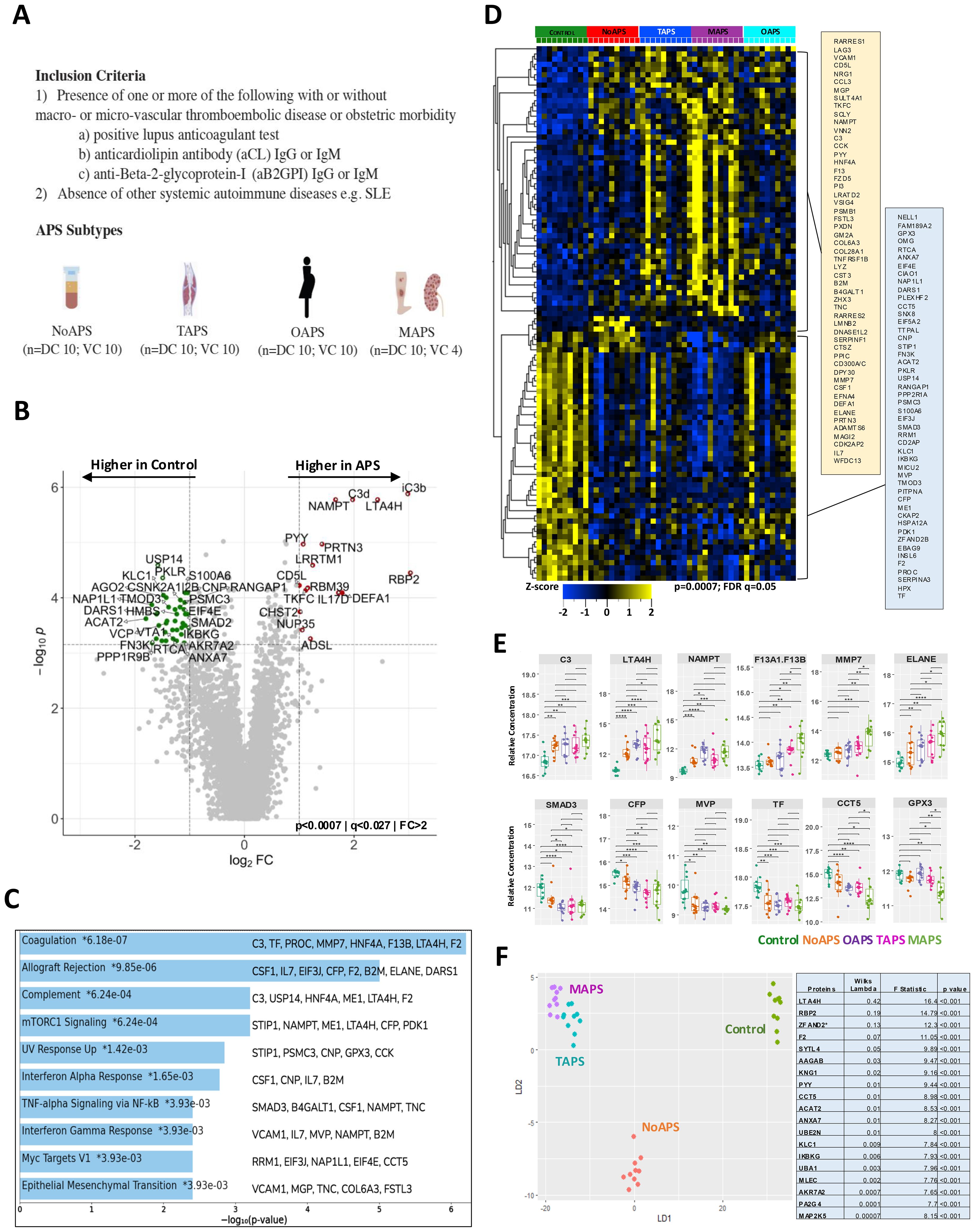 Figure 1. Presence of antiphospholipid antibodies confers a distinct proteomic signature shared by all APS subtypes. (A) Study cohorts and inclusion criteria. APS subtypes: NoAPS, aPL positivity without thromboembolism/obstetric morbidity; TAPS, history of thromboembolism, not meeting criteria for microvascular APS; OAPS, history of obstetric morbidity only; MAPS, biopsy-proven microvascular APS or history of definite catastrophic APS (61). n, sample size; DC, discovery cohort; VC, validation cohort. (B) Volcano plot of differentially abundant proteins between controls and all APS combined (p < 0.0007; q < 0.027; fold-change (FC)>2). All proteins are shown. Red dots, proteins higher in APS; green dots, proteins higher in controls. (C) Top 10 pathways enriched (KEGG 2021) in APS derived from protein list in B, along with the corresponding p-values. Asterisk (*) denotes that the term also has a adjusted p < 0.005. (E) Select differentially abundant proteins (C3, LTA4H, NAMPT, F13, MMP7, ELANE, SMAD3, CFP, MVP, TF, CCT5, GPX3); FDR-corrected t-test on log2-normalized data; ****p<0.0001; ***p<0.001; **p<0.01; *p<0.05. (D) Z-score heatmap of differentially abundant proteins (rows; table on right) between different APS subtypes and controls (columns); ANOVA, p ≤ 0.0007, FDR q ≤ 0.05. (F) Unsupervised clustering of non-obstetric APS and controls by linear discriminant analysis (proteins tabulated on right together with Wilks lambda, F-statistic and p-value).