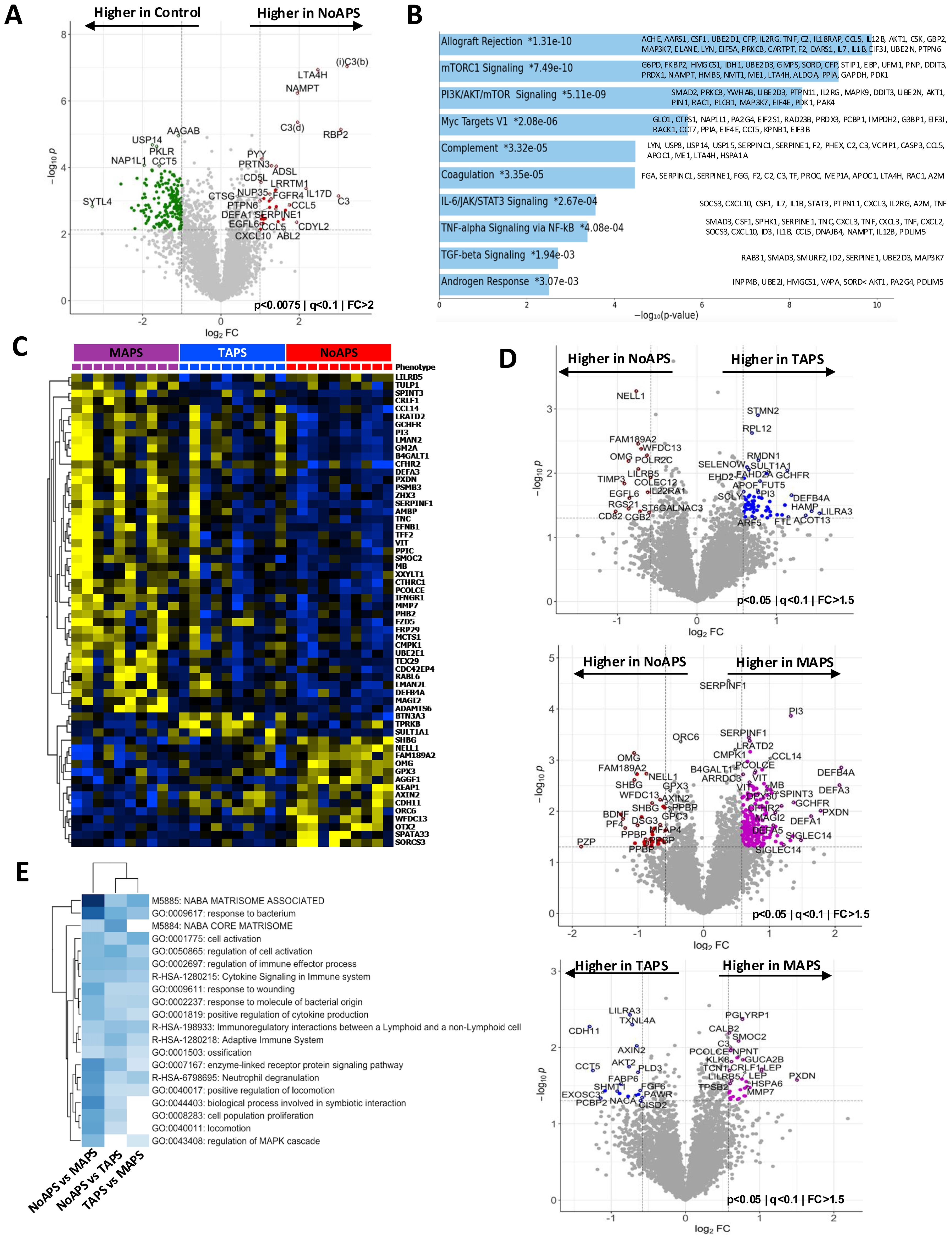 Figure 2. Plasma proteomic abnormalities associated with the ‘first-hit’; increasing thromboinflammation in TAPS and MAPS. (A) Volcano plot of differentially abundant proteins between NoAPS and controls (p < 0.0075; q < 0.1; fold-change (FC)>2). All proteins are shown. Red dots, proteins significantly higher in aPL; green dots, proteins significantly higher in controls. (B) Bar chart showing top 10 enriched terms (KEGG 2021) in the protein list generated by the pairwise analysis of NoAPS vs control in A, along with the corresponding p-values. Asterisk (*) denotes that the term also has a p < 0.005). (C) Z-score heatmap of differentially abundant proteins (rows; tabulated on right) between NoAPS, TAPS and MAPS (columns); ANOVA, p ≤ 0.0007, FDR q ≤ 0.1. (D) Volcano plots of differentially abundant proteins derived from three individual pairwise analyses between NoAPS and TAPS (top), NoAPS and MAPS (middle), and TAPS and MAPS (bottom) (p < 0.05; i<0.1; fold-change (FC)>1.5). All proteins are shown. Colored dots depicting differentially abundant proteins, directionality shown on the plots. (E) Heatmap showing the top 20 enriched terms derived from the protein sets (p < 0.05) obtained from the pairwise analyses between NoAPS and TAPS, NoAPS and MAPS and TAPS and MAPS in D.