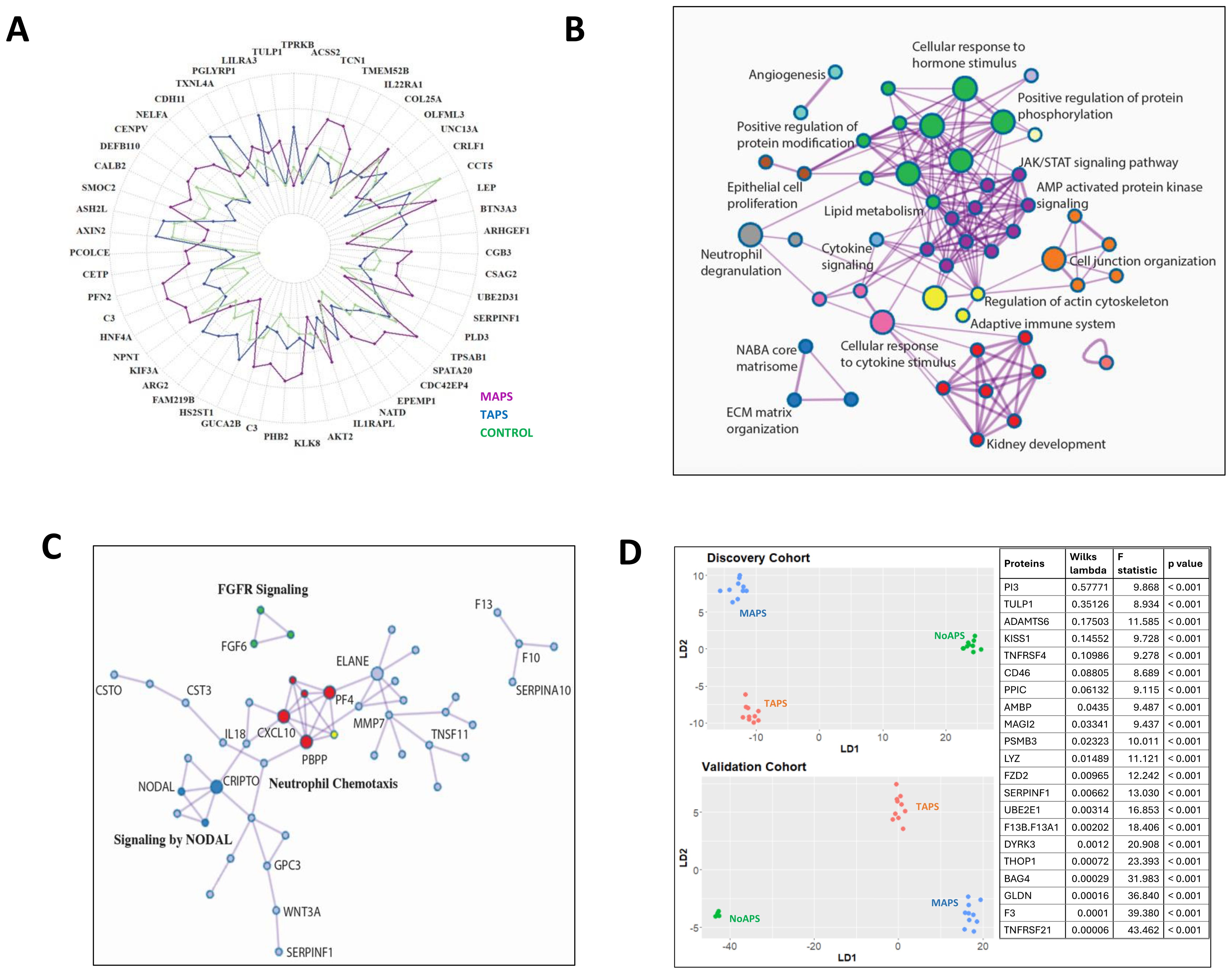 Figure 3. Thromboinflammation resulting in extracellular matrix reorganization in MAPS (A) Radial plot of the top 50 differentially abundant proteins comparing MAPS (purple) with TAPS (blue); relative protein abundance in controls (green) shown as baseline. (B) Network plot of enriched terms obtained from differential protein list from TAPS vs. MAPS comparison (Figure 2D). Terms with a similarity of >0.3 are connected by edges. Each node represents an enriched term and is colored by its cluster ID. The most significant of the enriched terms are labeled in the network plot. (C) Protein-protein interaction enrichment analysis of 85 proteins belonging to ECM-associated pathways complied from the pairwise analyses between aPL or TAPS and MAPS. Network contains proteins that form physical interactions with at least one other member in the list. Pathway enrichment analysis applied to the most densely connected network components. Most significant terms include neutrophil chemotaxis (red), FGFR signaling (green), and NODAL pathways (dark blue). (D) Linear discriminant analysis/unsupervised clustering of NoAPS, TAPS and MAPS in validation cohort (bottom plot) using protein set generated by linear discriminant analysis in discovery cohort (top plot) (outlined in the panel on right together with Wilks lambda, F-statistic and p-value).