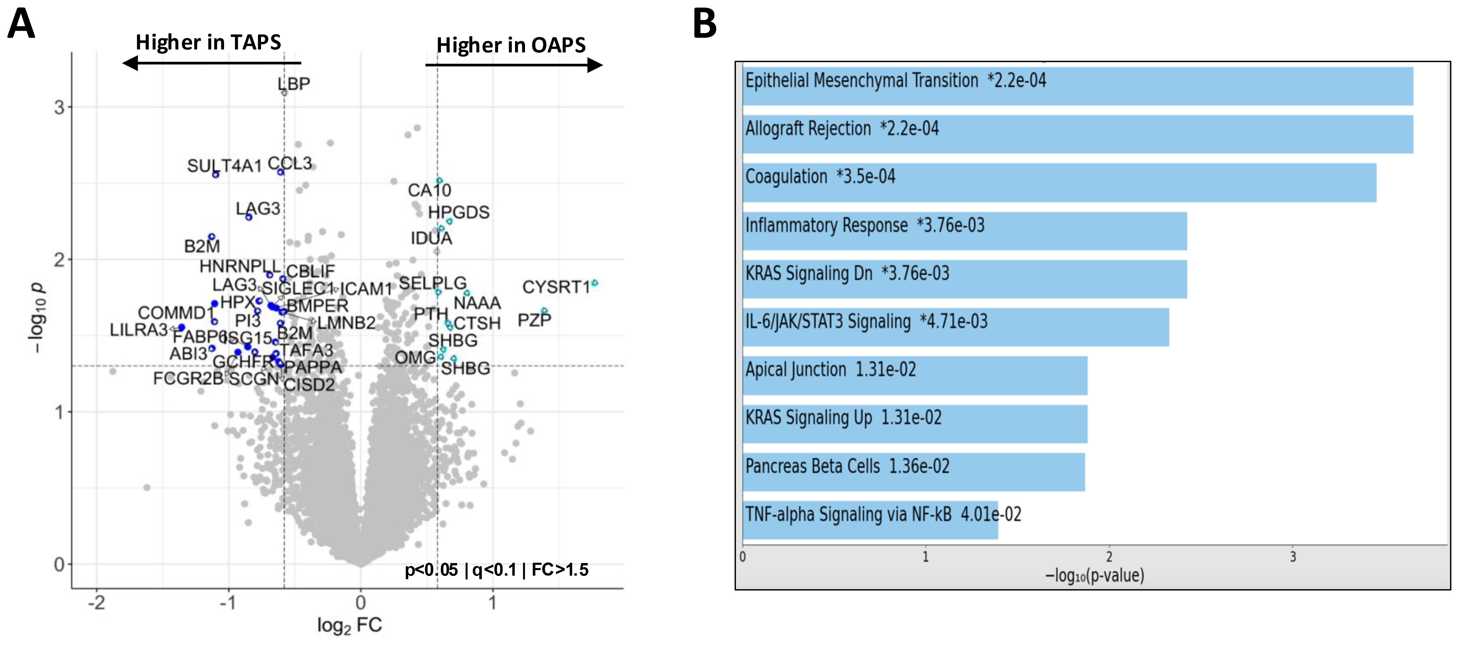 Figure 4. Plasma proteomics abnormalities in OAPS. (A) Volcano plot of differentially abundant proteins between TAPS and OAPS (p<0.05; q<0.1; fold change (FC)>1.5). (B) Bar chart showing the top 10 enriched terms (KEGG 2021 Human Library) in the protein list generated by the pairwise analysis of TAPS vs OAPS in A, along with the corresponding P values. Asterisk (*) denotes that the term also has a significant adjusted P value (<0.005).