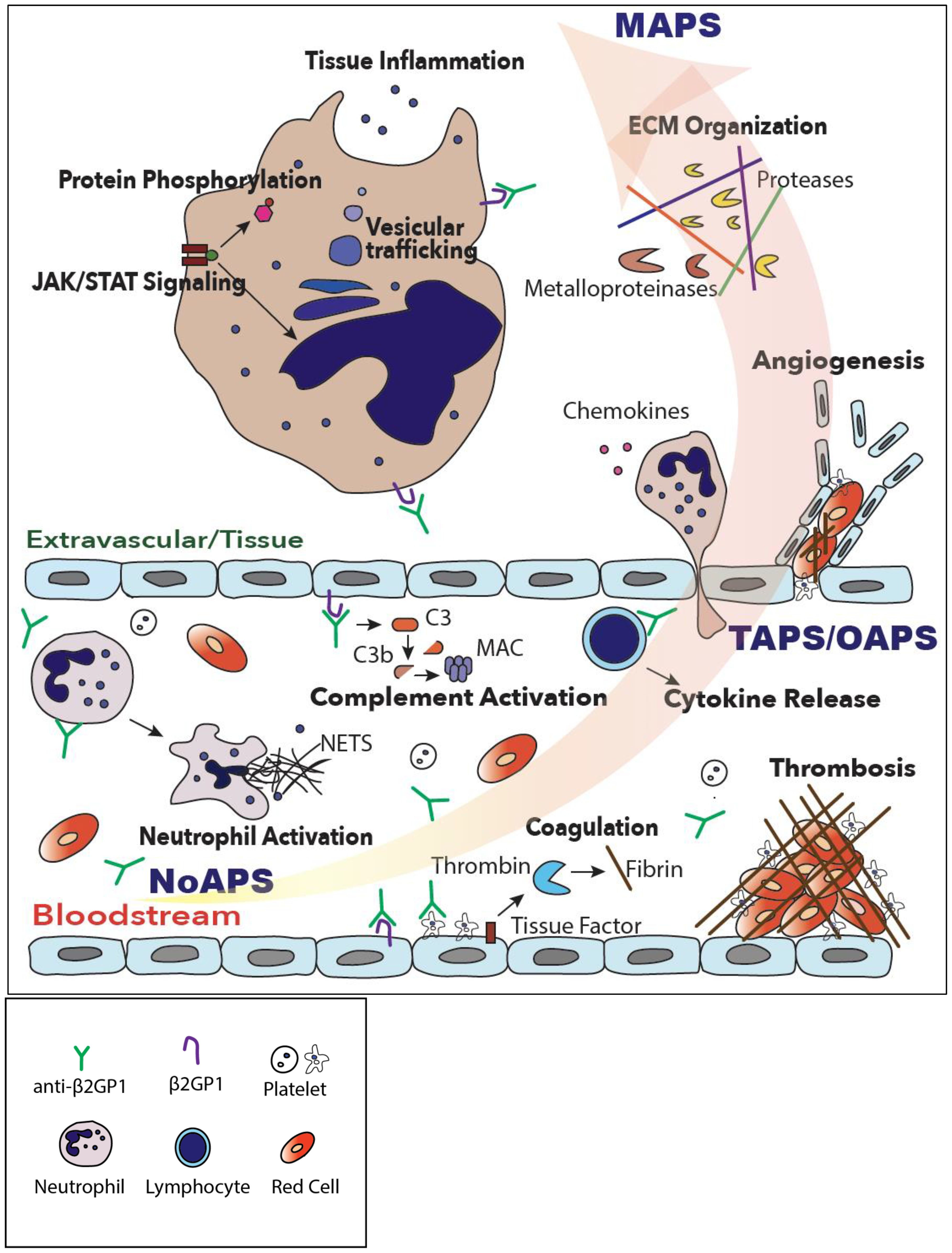 Figure 5. A model of progressive thromboinflammation in primary APS. While complement, coagulation and neutrophil activation are already evident in high-risk, ‘triple-positive’, laboratory APS (NoAPS), clinical subtypes of APS, OAPS, TAPS but particularly microvascular/catastrophic APS (MAPS), are characterized by severe thromboinflammation involving activation of intracellular signaling pathways, vesicular trafficking, protein phosphorylation, tissue inflammation and extracellular matrix organization.