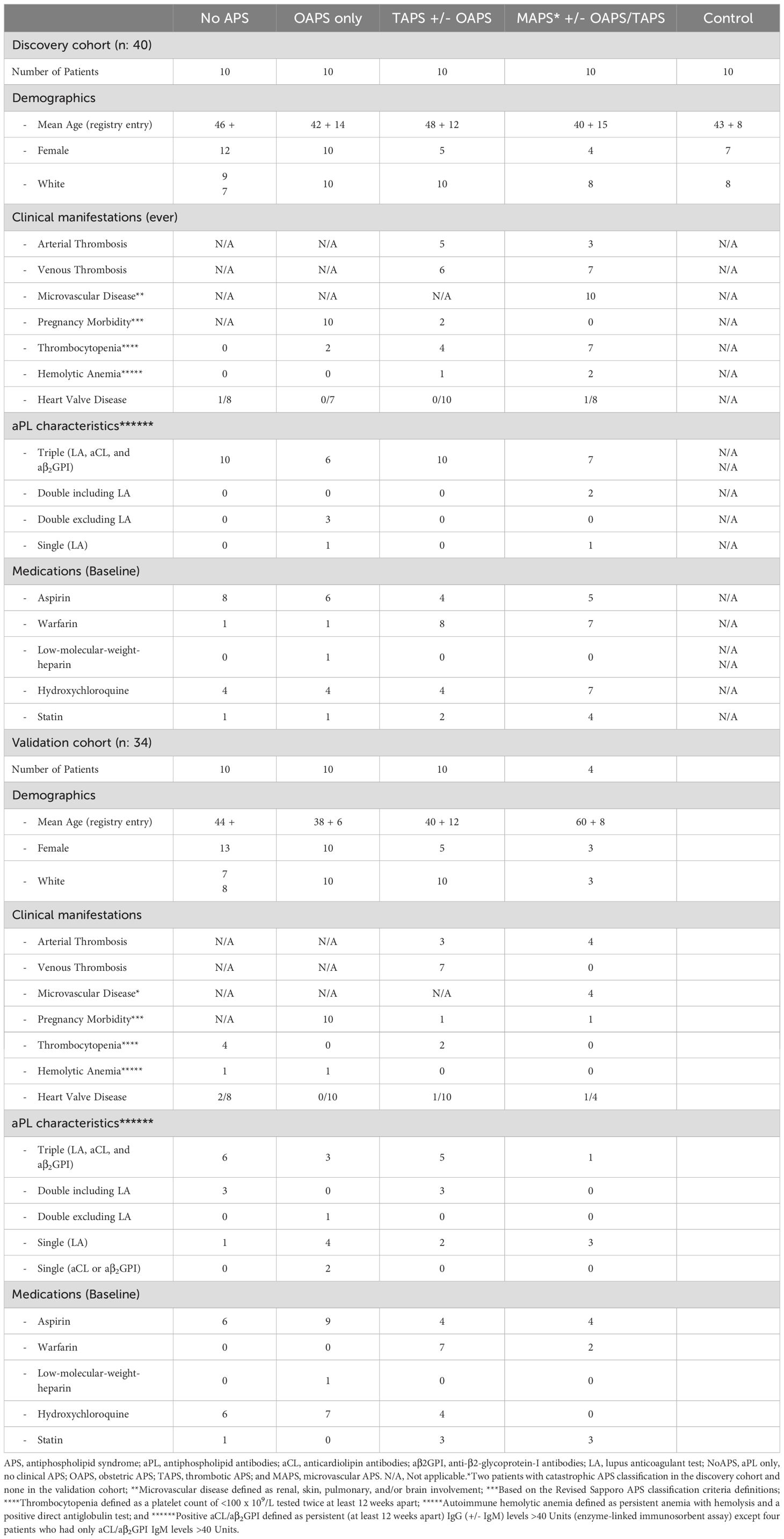 Plasma samples were obtained from APS ACTION registry, an international and collaborative clinical registry and repository of blood samples. All patients included in this study were persistently aPL-positive (measured on two occasions 12 weeks apart) and without systemic autoimmune rheumatic diseases (SARDs) (19). Samples were not obtained during the time of the event, but at the time of outpatient referral/enrollment. Samples were split into discovery (North American Centers) and validation (European Centers) cohorts (Figure 1, Table 1).