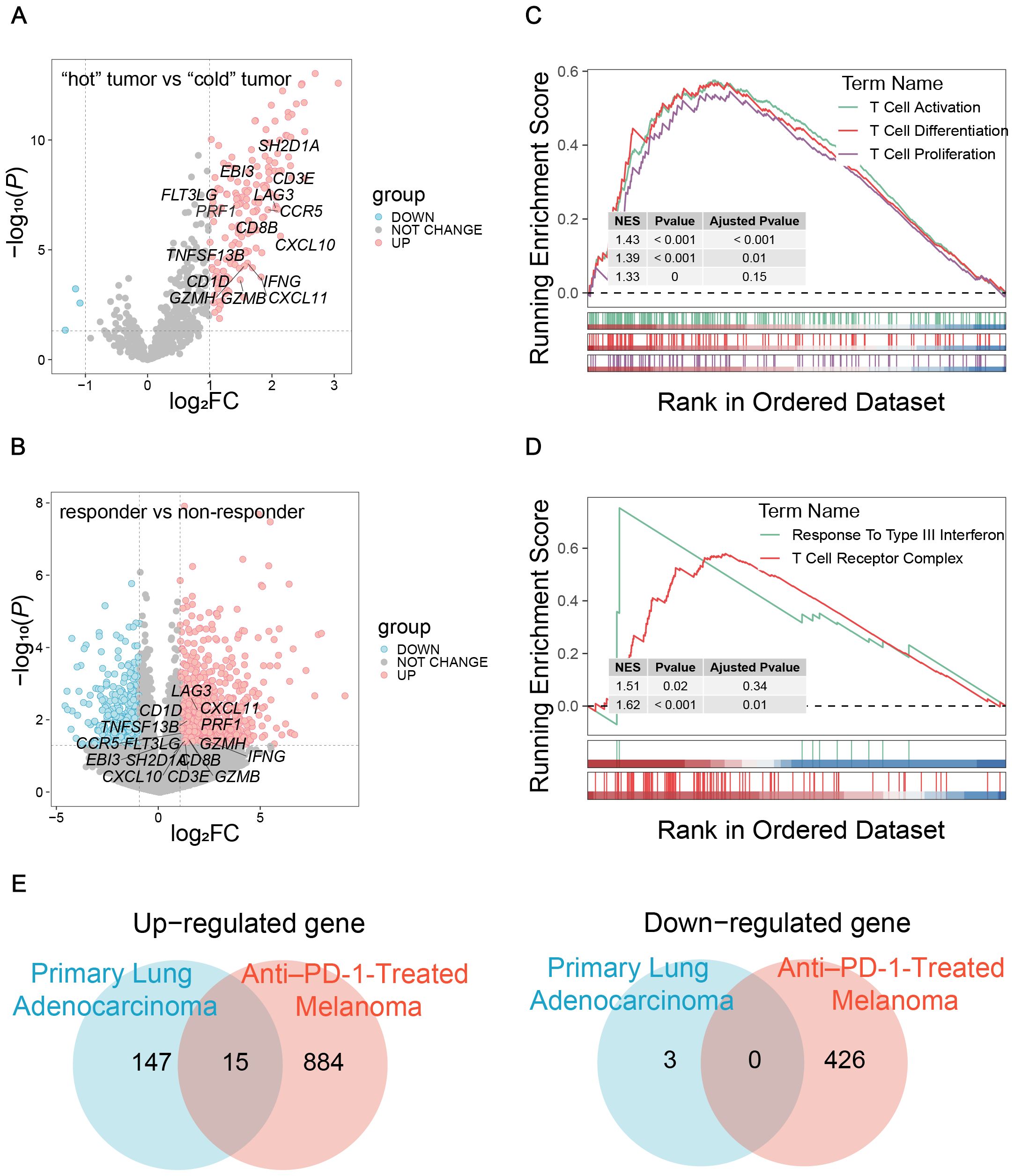 Figure 1. Construction of TIME-GES. (A) Volcano plots showed the DEGs in primary lung adenocarcinoma cohort. (B) Volcano plots showed the DEGs in anti–PD-1-treated melanoma cohort. (C, D) GSEA showed that immune related pathways enriched by DEGs in primary lung adenocarcinoma and anti–PD-1-treated melanoma cohorts, respectively. (E) Venn diagram showing overlapped up-regulated and down-regulated DEGs between primary lung adenocarcinoma and anti–PD-1-treated melanoma cohorts.