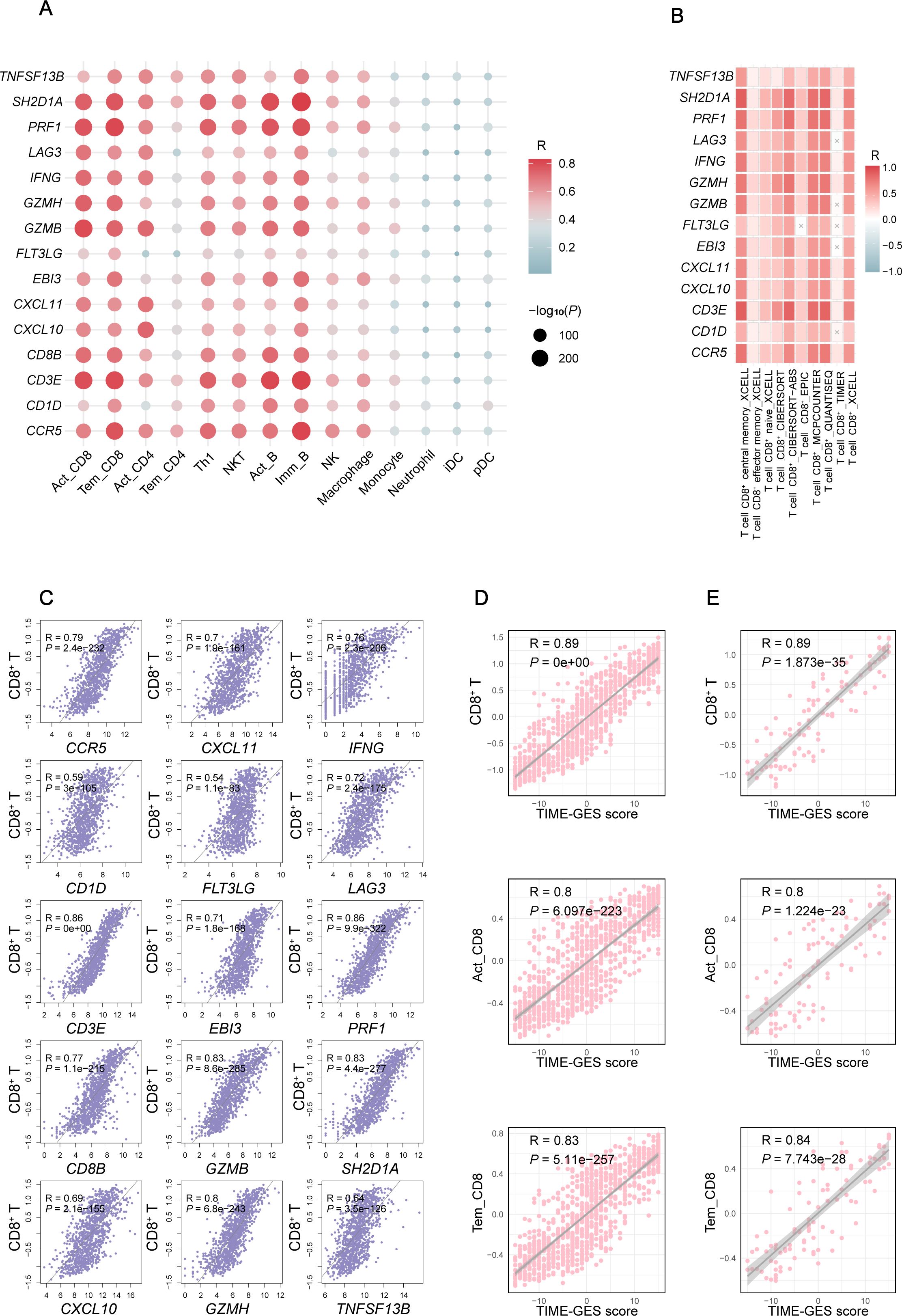 Figure 2. TIME-GES reflects TIME characteristics. (A) Correlation of TIME-GES genes expression with the infiltration for 14 immune cell types in BC. (B) Correlation of TIME-GES genes expression with T cells infiltration using multiple algorithms in BC. (C) Correlation between TIME-GES gene expression and CD8+ T cells in BC. (D) Correlation between TIME-GES score and CD8+ T, Act_CD8, and Tem_CD8 in BC. (E) Correlation between TIME-GES score and CD8+ T, Act_CD8 and Tem_CD8 cells in TNBC.