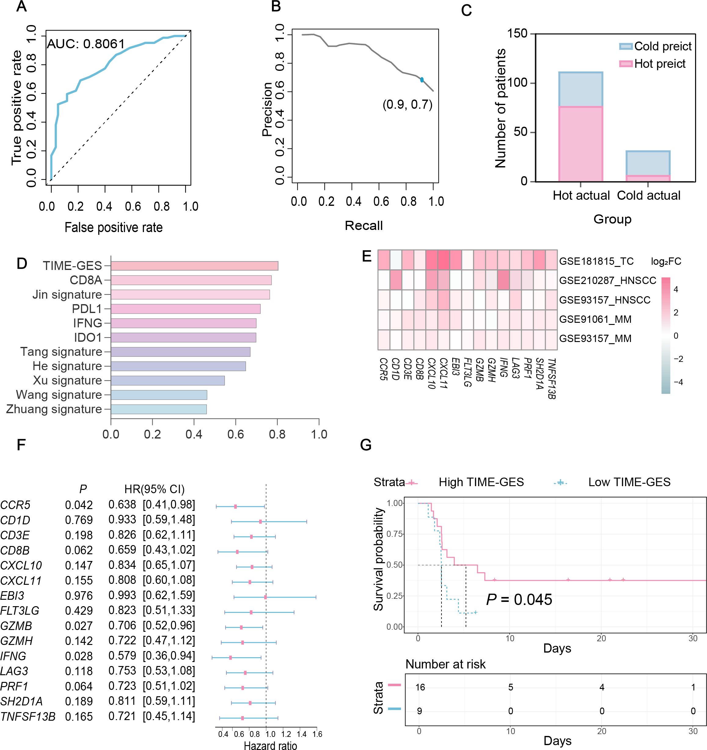 To assess the predictive capability of TIME-GES in distinguishing tumor immune phenotypes, we utilized the TIME-GES score to generate ROC curves. The analysis showed that the AUC was greater than 0.8, demonstrating strong predictive performance (Figure 3A). Additionally, the precision and recall of TIME-GES were 0.7 and 0.9, respectively (Figure 3B), with an overall accuracy of 71% in classifying tumors as “cold” and “hot” (Figure 3C). To further evaluate the potential of TIME-GES genes as predictors of tumor immune responsiveness, we compared its predictive power against six established tumor immune-related gene signatures (25–30), and four widely used ICB response biomarkers (15). The results showed that TIME-GES outperformed existing signatures in identifying “hot” tumors (Figure 3D).