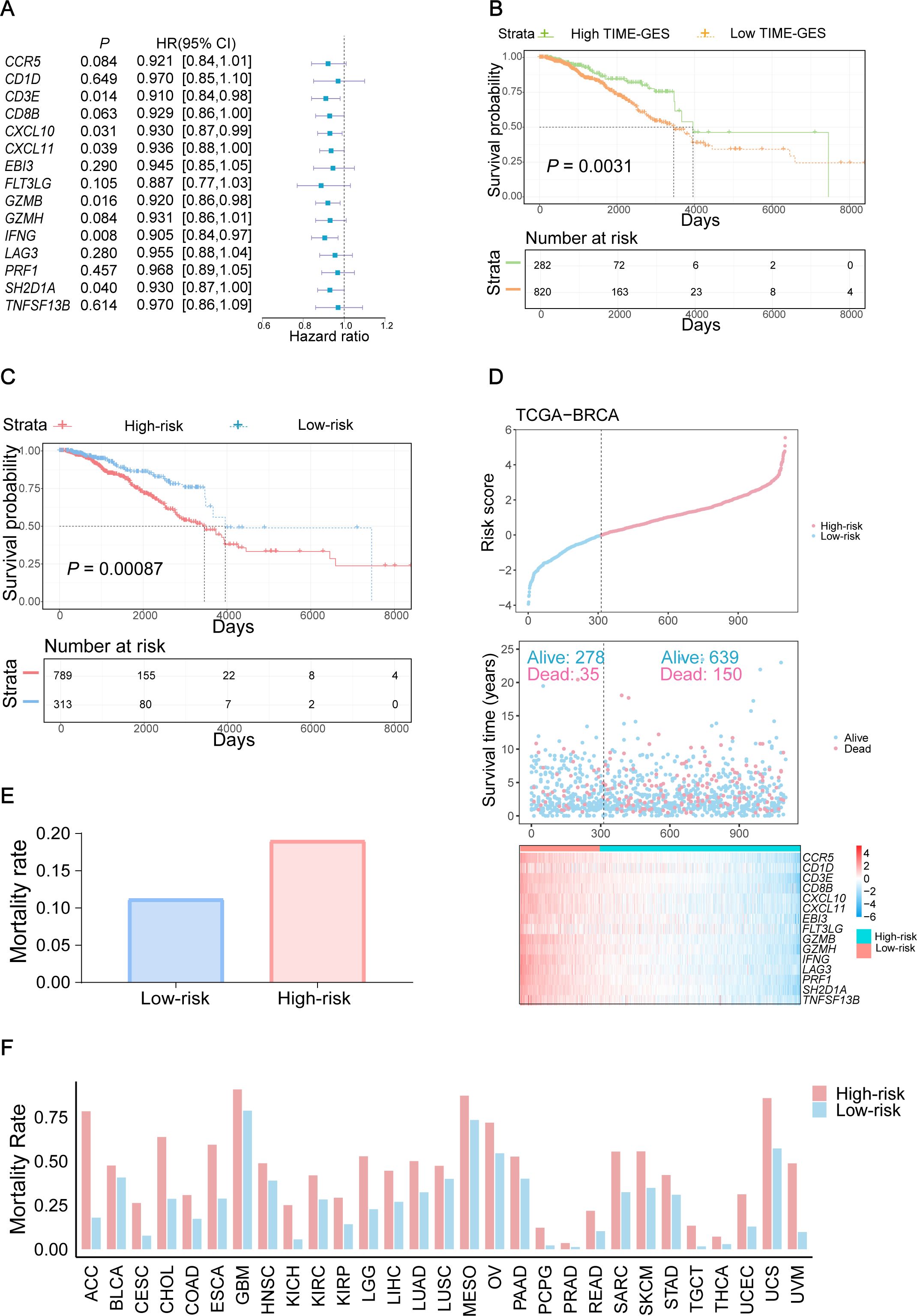 Figure 4. TIME-GES is an independent prognostic biomarker. (A) The forest plot showing the result of univariate Cox analysis for TIME-GES genes and OS in BC. (B, C) Kaplan–Meier survival curves based on TIME-GES score and risk score in BC. The patients were divided into the high TIME-GES and low TIME-GES groups based on the TIME-GES score, as well as the high-risk low and risk groups due to risk scores. (D) Top: Risk scores derived from TIME-GES gene expression and coefficients, ranked across 1102 BC patients. Middle: Distribution of overall survival corresponding to the ranked risk scores. Bottom: Expression heatmap of individual TIME-GES genes in the 1102 patients. (E) Correlation between risk scores, and mortality in BC. (F) Correlation of risk score with patient mortality across 29 cancer types.