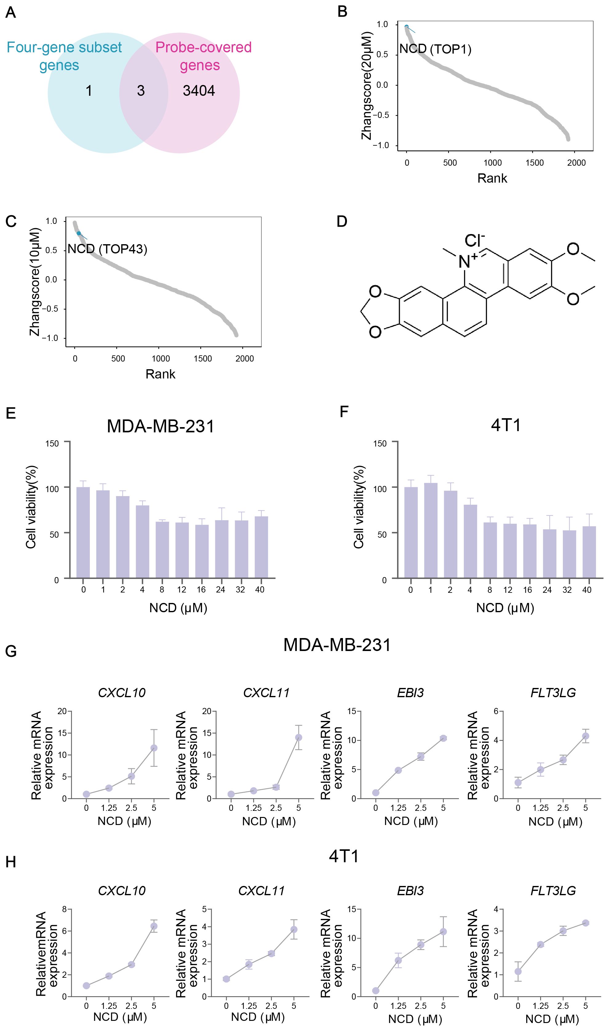 Figure 5. TIME-GES guided identification of NCD as an immunotherapeutic candidate for TNBC. (A) Venn diagram showing the overlap between 4 highly expressed genes in TNBC from TIME-GES genes and 3,407 genes detected in large-scale transcriptomic dataset generated from 1,865 natural products perturbation. (B, C) The rank of scores for 1,865 natural products at 20 μM and 10 μM concentrations datasets, respectively. (D) Chemical structure of NCD. (E, F) Cell viability assays in MDA-MB-231 and 4T1 cells after 24 h NCD treatment, respectively (n=3). (G, H) mRNA expression of 4 highly expressed genes in BC after NCD treatment in MDA-MB-231 and 4T1 cells, respectively (n=3).