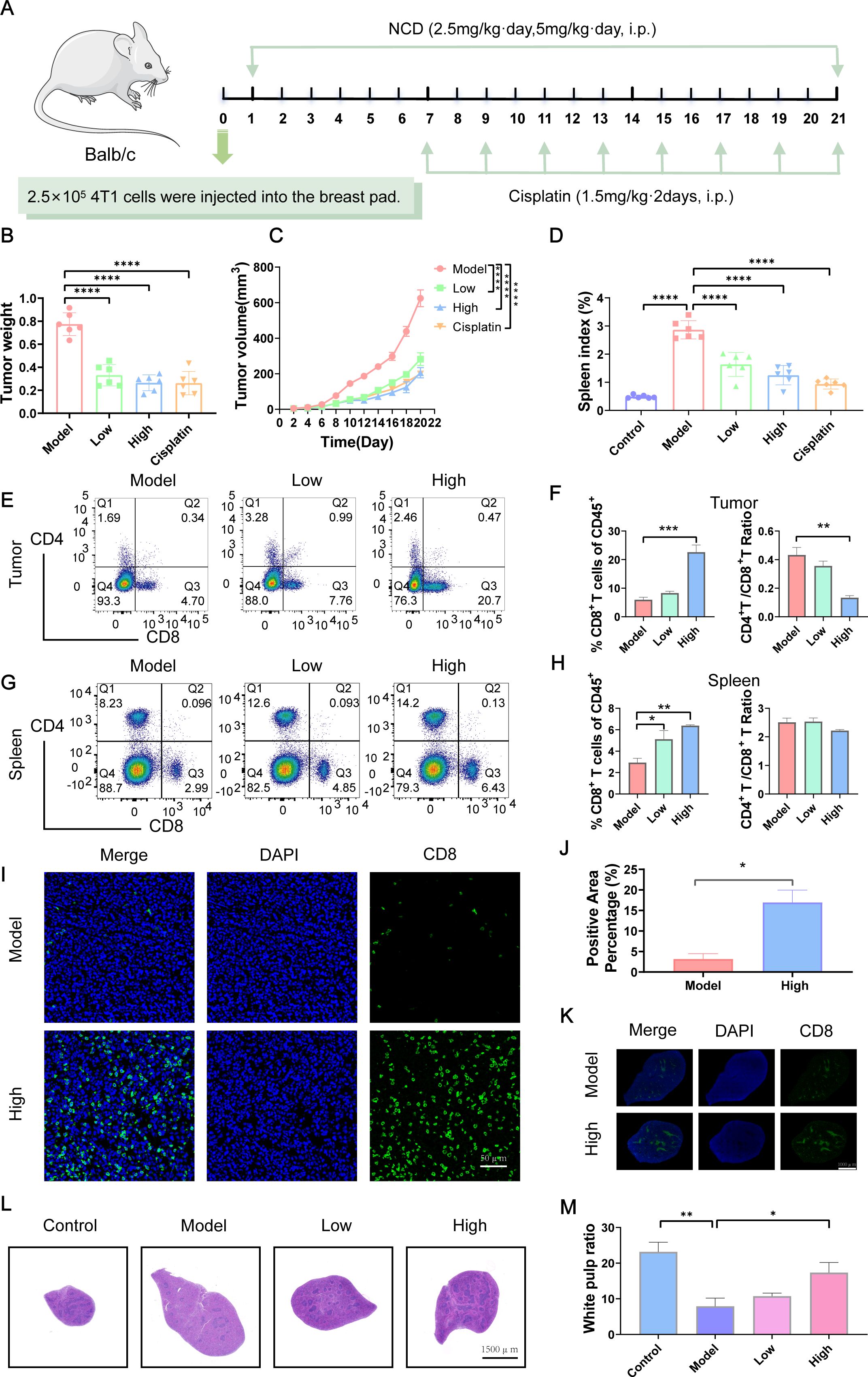 Figure 6. NCD reprograms TIME and suppresses TNBC tumor growth in vivo. (A) Design of animal experiments. (B) Final tumor weight (n=6). (C) Tumor growth curves (n=6). (D) Mouse spleen index (n=6). (E) FCM analysis of CD8+ T cells populations in tumor (n=3). (F) Quantification of CD8+ T cells populations in tumors corresponding to (E) (n=3). (G) FCM analysis of CD8+ T cells populations in spleen (n=3). (H) Quantification of CD8+ T cells populations in spleen corresponding to (G) (n=3). (I) IF staining of CD8+ T cells in tumors from model and high-dose groups (n=3). (J) Quantification of tumor CD8+ T IF staining (n=3). (K) CD8+ T cells IF staining in spleens of model and high-dose groups (n=3). (L) H&E staining of mouse spleen (n=3). (M) Quantification of spleen H&E staining corresponding to (L) (n=3). In all panels, “Control” represents non-tumor-bearing mice, while “Model” indicates mice subjected to tumor induction. Treatment groups are labeled according to NCD dose: “Low” corresponds to 2.5 mg/kg, and “High” to 5 mg/kg. Cisplatin serves as the positive control. *P < 0.05, **P < 0.01, ***P < 0.001.