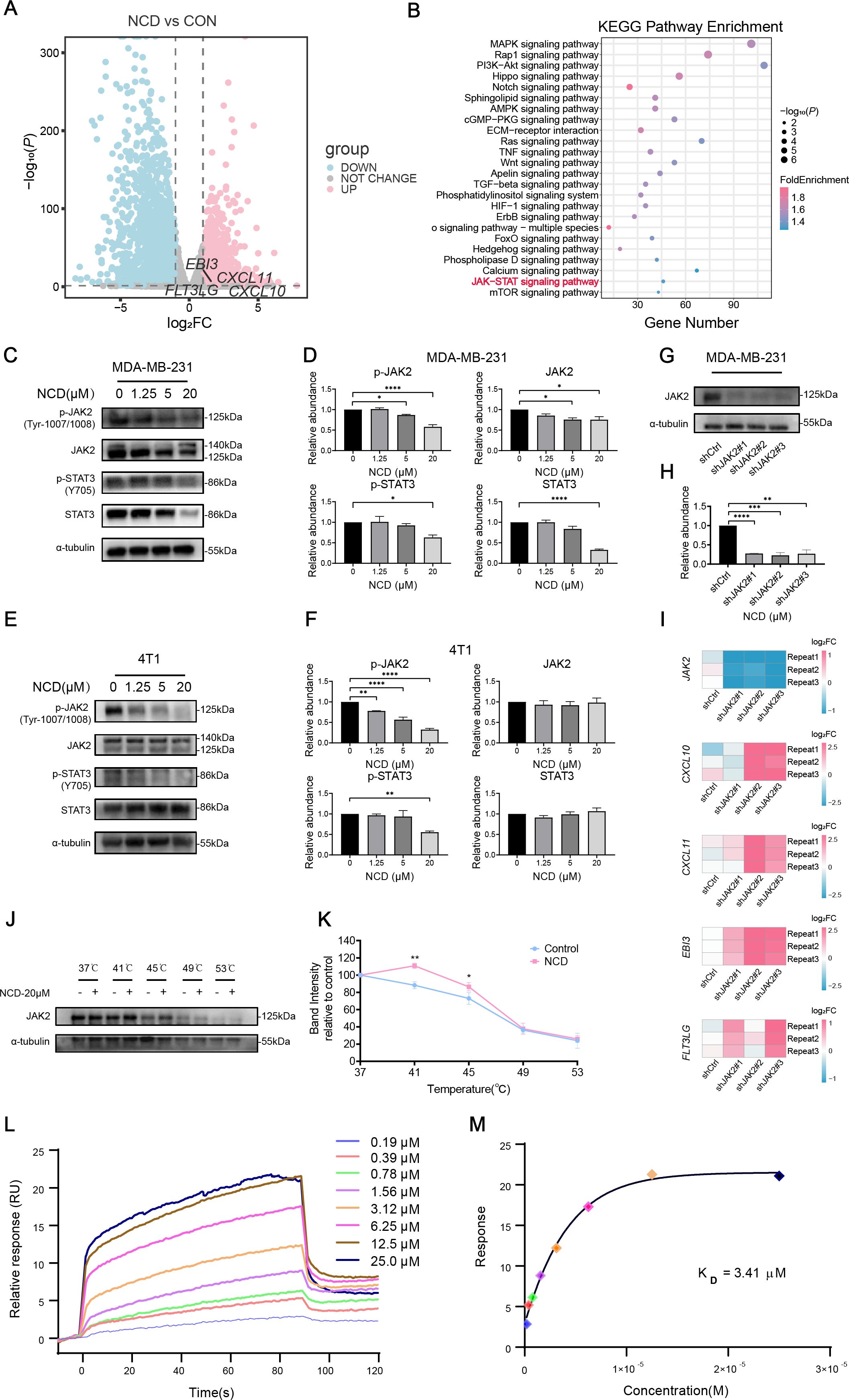 Figure 7. The immune microenvironment–reprogramming function of NCD is mediated by JAK2 inhibition. (A) Volcano plot of DEGs in MDA-MB-231 cells treated with or without 5 μM NCD. (B) KEGG enrichment analysis of DEGs. (C) Western blot of JAK2, p-JAK2, STAT3, and p-STAT3 in MDA-MB-231 cells treated with increasing doses of NCD (n=3). (D) Quantification of JAK2, p-JAK2, STAT3, and p-STAT3 proteins corresponding to (C) (n = 3). (E) Western blot of JAK2, p-JAK2, STAT3, and p-STAT3 in 4T1 cells treated with increasing doses of NCD (n=3). (F) Quantification of JAK2, p-JAK2, STAT3, and p-STAT3 proteins corresponding to (E) (n = 3). (G) Protein expression levels of JAK2 after knockdown of JAK2 in MDA-MB-231 cell line (n=3). (H) Quantification of JAK2 protein levels corresponding to (G) (n=3). (I) mRNA expression levels of JAK2, CXCL10, CXCL11, EBI3, FLT3LG after knockdown of JAK2 in MDA-MB-231 cell (n=3). (J) Protein stability of JAK2 under thermal gradient with or without NCD (n=3). (K) CETSA Melting Curve (n=3). (L) SPR sensorgrams of JAK2 binding to NCD. (M) Affinity analysis and KD calculation of JAK2-NCD interaction. *P < 0.05, **P < 0.01, ***P < 0.001, ****P < 0.0001