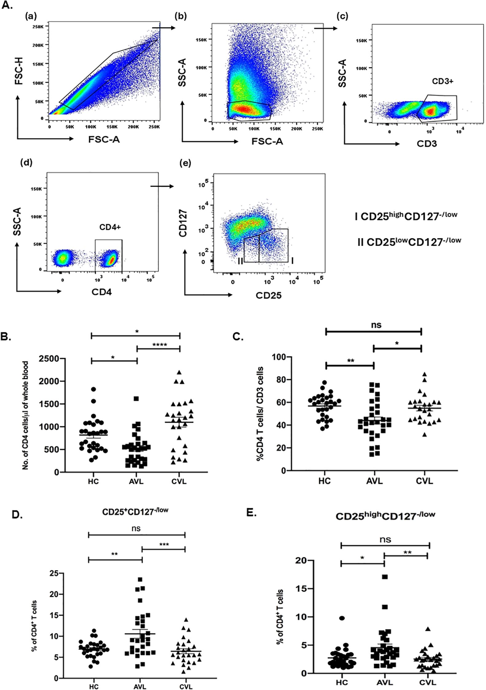 Figure 1. Increased Treg cell frequencies in active VL infection. Percentage of CD3, CD4 and Treg (CD4+CD127-/lowCD25+ and CD4+CD127-/lowCD25high) cells for active VL (AVL) (n = 29 except CD25high Treg; n=30), cured VL (CVL) (n=26 except CD25high Treg; n=25) and healthy controls (HC) (n=28) were determined through flow cytometry. Briefly, fresh blood cells were stained for CD3, CD4, CD127 and CD25 expression and gated on lymphocytes (A). The T cell frequencies were represented as number of CD4 cells (B) and percentage of CD4+ (C), CD4+CD127-/lowCD25+ (D) and CD4+CD127-/lowCD25high (E). Each symbol represents percentage of T cells for one individual. Thick horizontal lines represent the mean values with standard error of mean (SEM) of each group. Total percentage of CD4+CD127-/lowCD25+ and CD4+CD127-/lowCD25high cells of CD4+ were significantly upregulated in the active VL patients when compared with cured individuals and healthy controls. Values for p were calculated using Ordinary one-way ANOVA with a single pooled variance followed by Tukey’s multiple-comparisons test; p < 0.05 was considered significant. 0.1234 (ns), 0.0332 (*), 0.0021 (**), 0.0002 (***), <0.0001 (****).