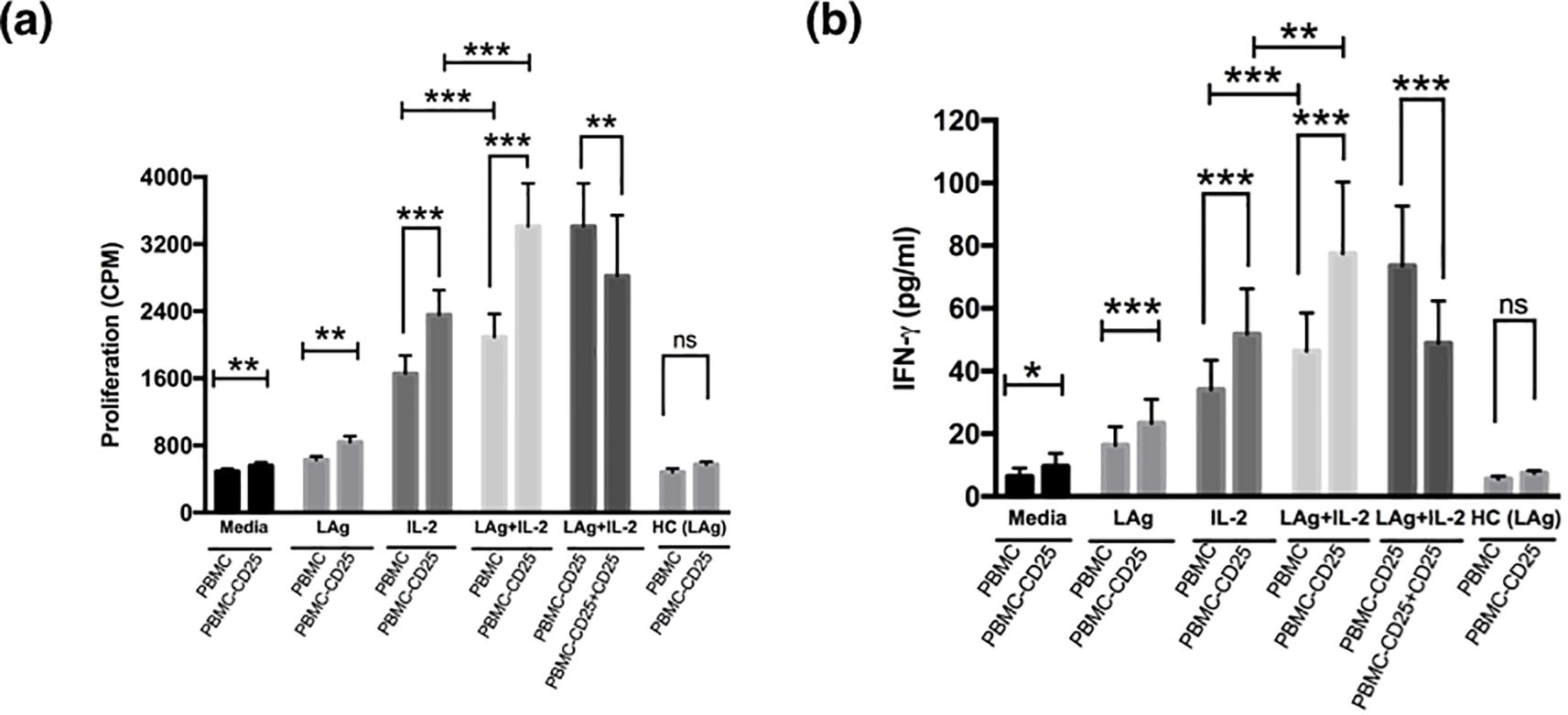 Figure 2. Treg cells suppress leishmanial antigen specific lymphoproliferation and cytokine production of active VL patients. (a) PBMCs and PBMCs depleted of CD25 cells (PBMC − CD25) of active VL patients were cultured (1× 105 cells) for 5 days with media alone, LAg (12.5 µg/ml), only IL-2 or LAg plus rIL-2 (20 U/ml) where rIL-2 was added at day 3 of culture. For proliferation, cells were pulsed with 0.5 μCi/well [3H] thymidine and cultured for another 18 hours. Depletion of CD25 cells enhanced antigen-specific proliferation and further addition of CD25 cells to the depleted population (PBMC - CD25) at 1:1 ratio downregulated proliferation significantly. (b) Cells were cultured as described in (a) and supernatant was collected before the addition of thymidine and IFN-γ was detected through ELISA. Depletion of CD25 from PBMCs significantly upregulated IFN-γ production and reconstitution of CD25 cells to the depleted population (PBMC - CD25) at 1:1 ratio significantly downregulated IFN-γ production. LAg stimulated PBMCs and PBMCs depleted of CD25 cells (PBMC − CD25) of healthy controls (n=5) were also included in each figure. Bars represent mean ± SEM of proliferation and IFN-γ production of active VL patients (n=10). Values for p were calculated using Wilcoxon signed rank test; p < 0.05 was considered significant. 0.1234 (ns), 0.0332 (*), 0.0021 (**), 0.0002 (***).